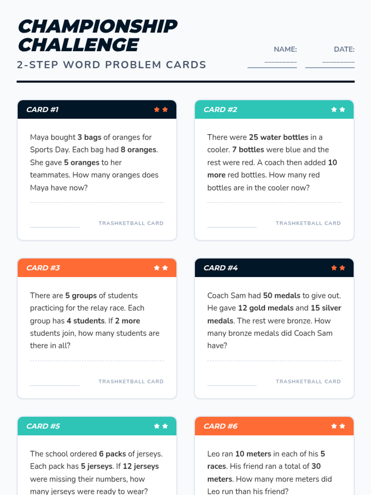 20 sports-themed math challenge cards for a Trashketball activity, featuring various two-step word problems (addition, subtraction, multiplication, and division) with age-appropriate complexity for 3rd grade.