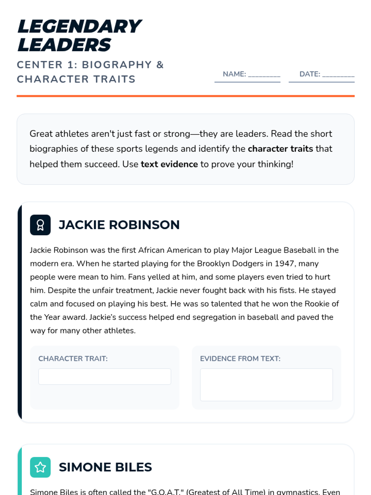 A reading center activity featuring three athlete biographies (Jackie Robinson, Simone Biles, Roberto Clemente) with a focus on identifying character traits and text evidence.