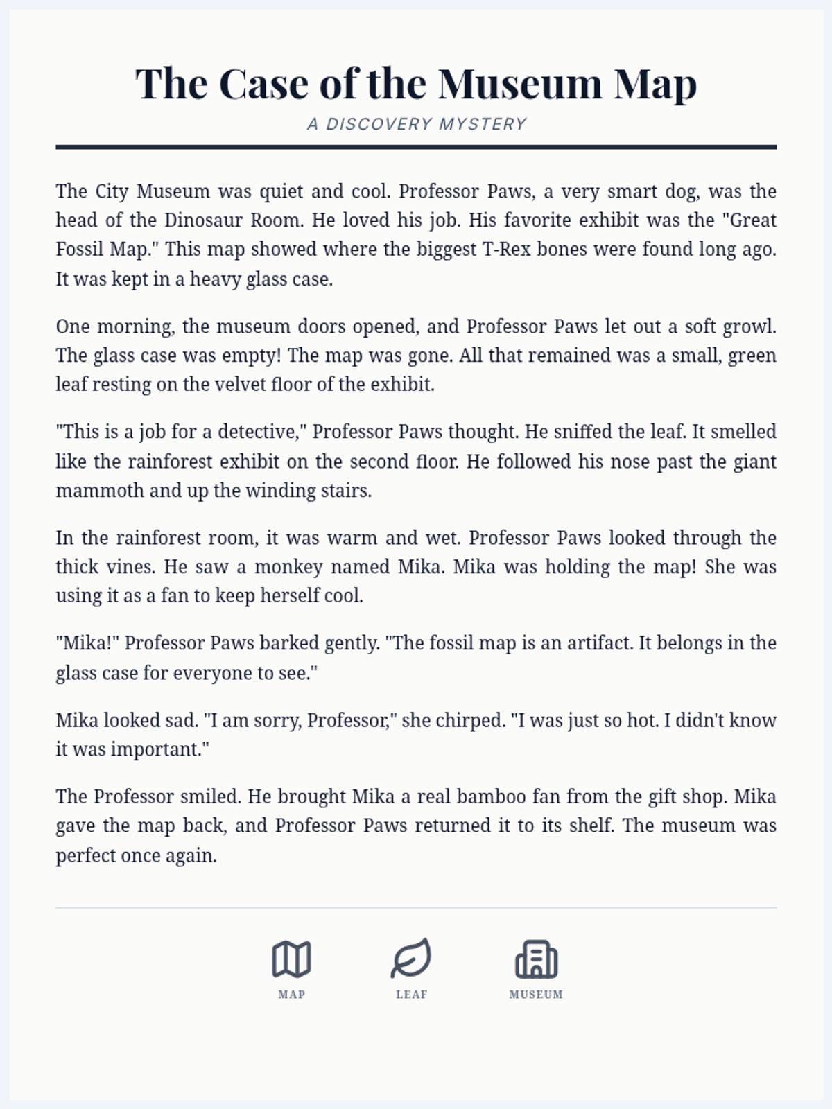 A descriptive mystery story about Professor Paws and the missing museum map, providing appropriate complexity for tiered assignments. Consolidated to one page.