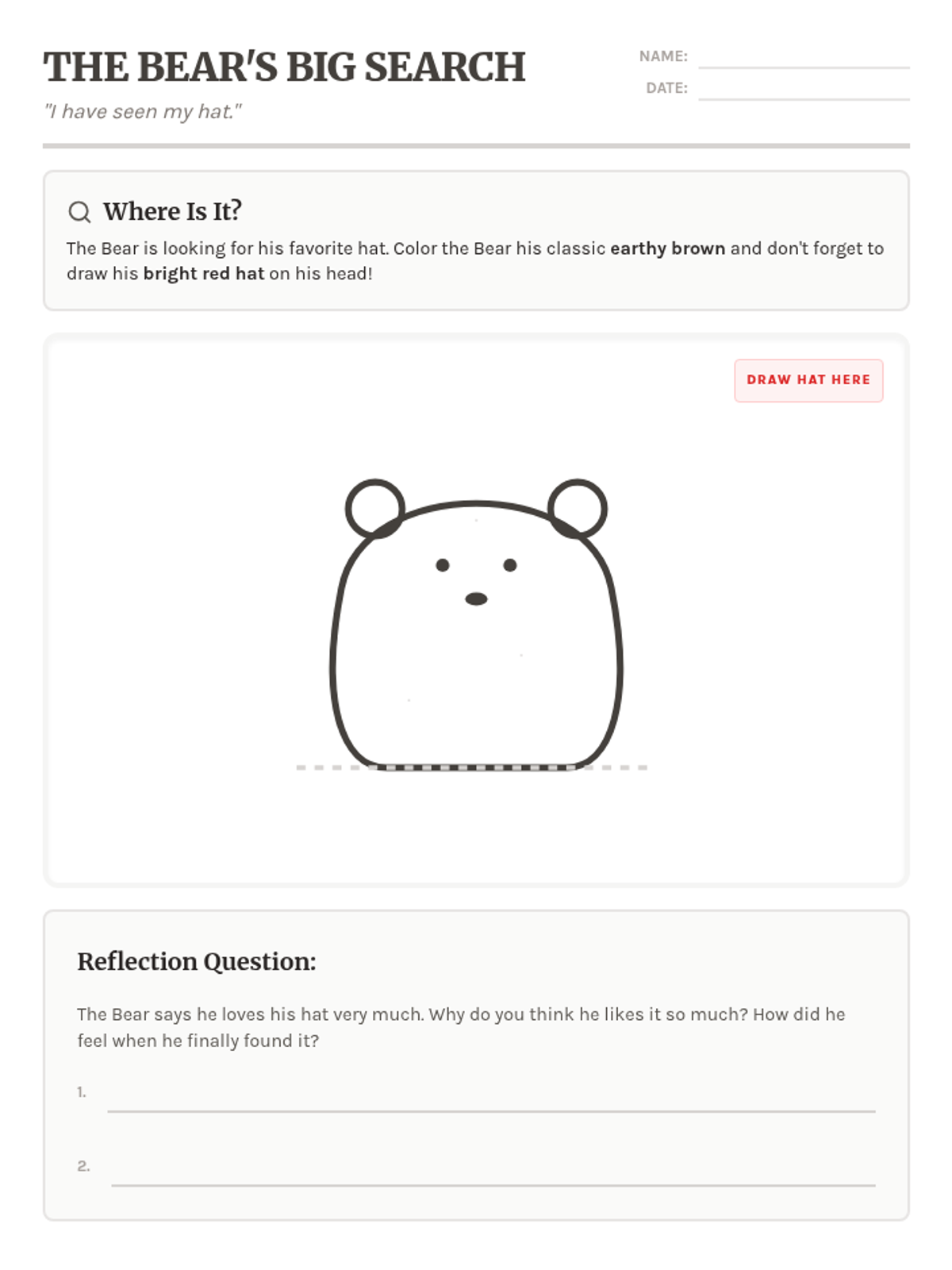 A coloring sheet featuring the Bear from 'I Want My Hat Back', with a prompt for students to draw the iconic red hat and reflect on the character's feelings. Fixes page breaks and layout issues.