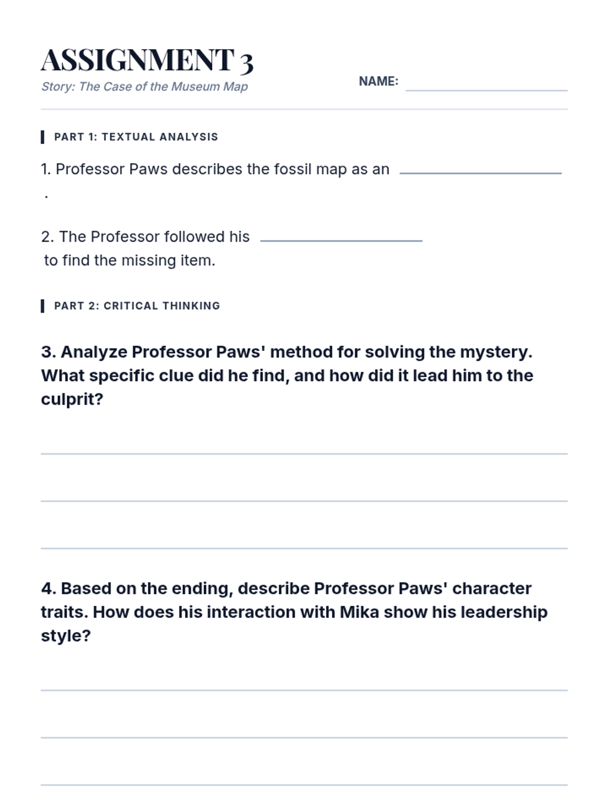 4th Grade comprehension worksheet for the Museum Map Mystery, focusing on textual analysis and characterization. Consolidated to one page.