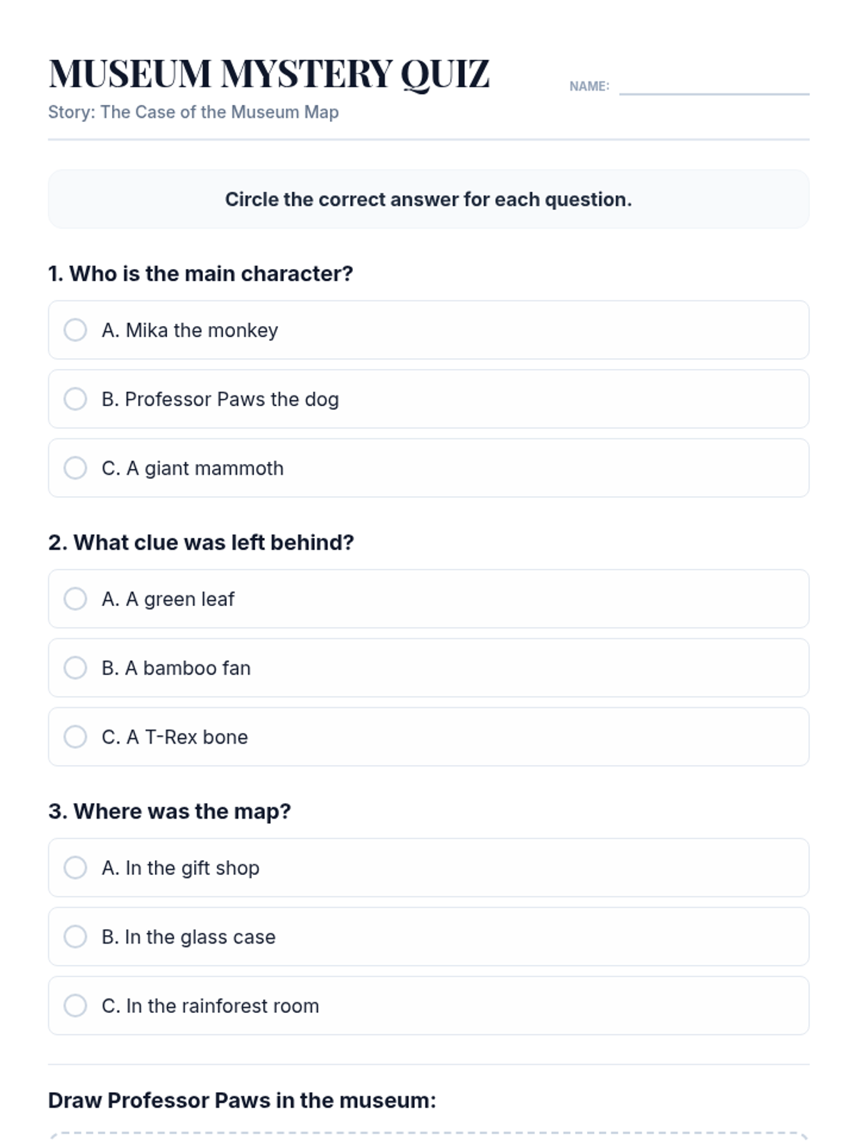 Updated Kindergarten-level comprehension worksheet for the Museum Map Mystery. Increased difficulty with 3 options per question and a larger drawing area, consolidated to a single page.