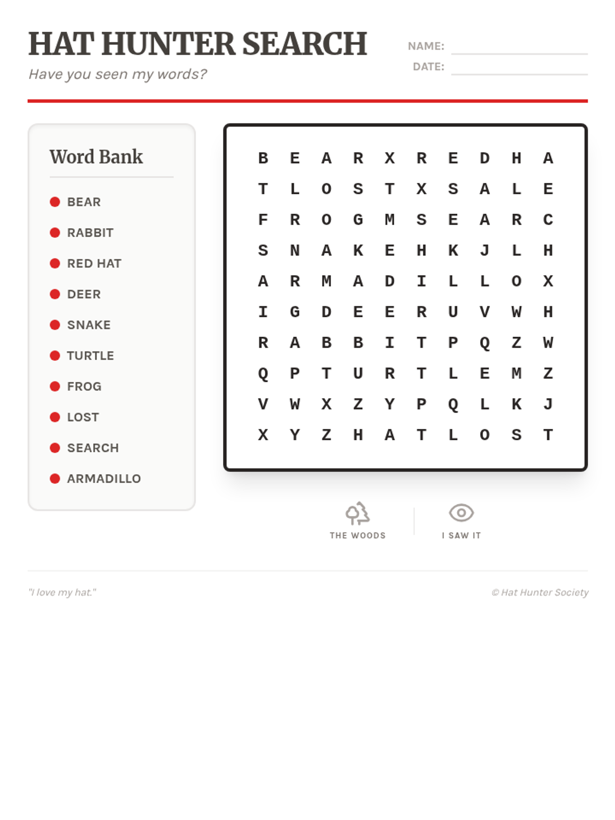 A themed word search for 'I Want My Hat Back' featuring character names and key plot words like RED HAT and LOST. Fixes word placement and bank consistency.