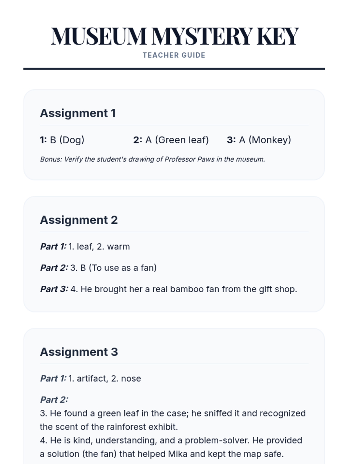 Updated teacher answer key for the Museum Map Mystery lesson, reflecting increased difficulty in Assignment 1.