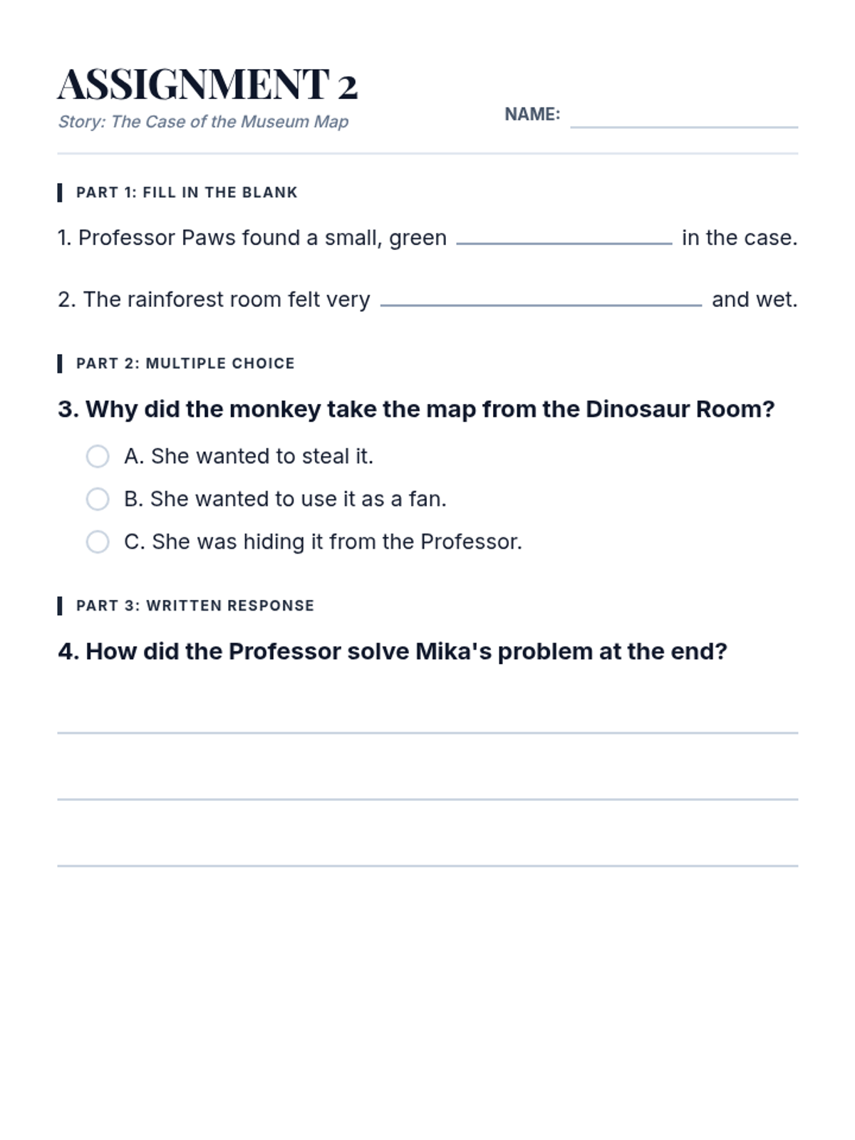 2nd Grade comprehension worksheet for the Museum Map Mystery, featuring fill-in-the-blank, multiple choice, and a written response. Consolidated to one page.