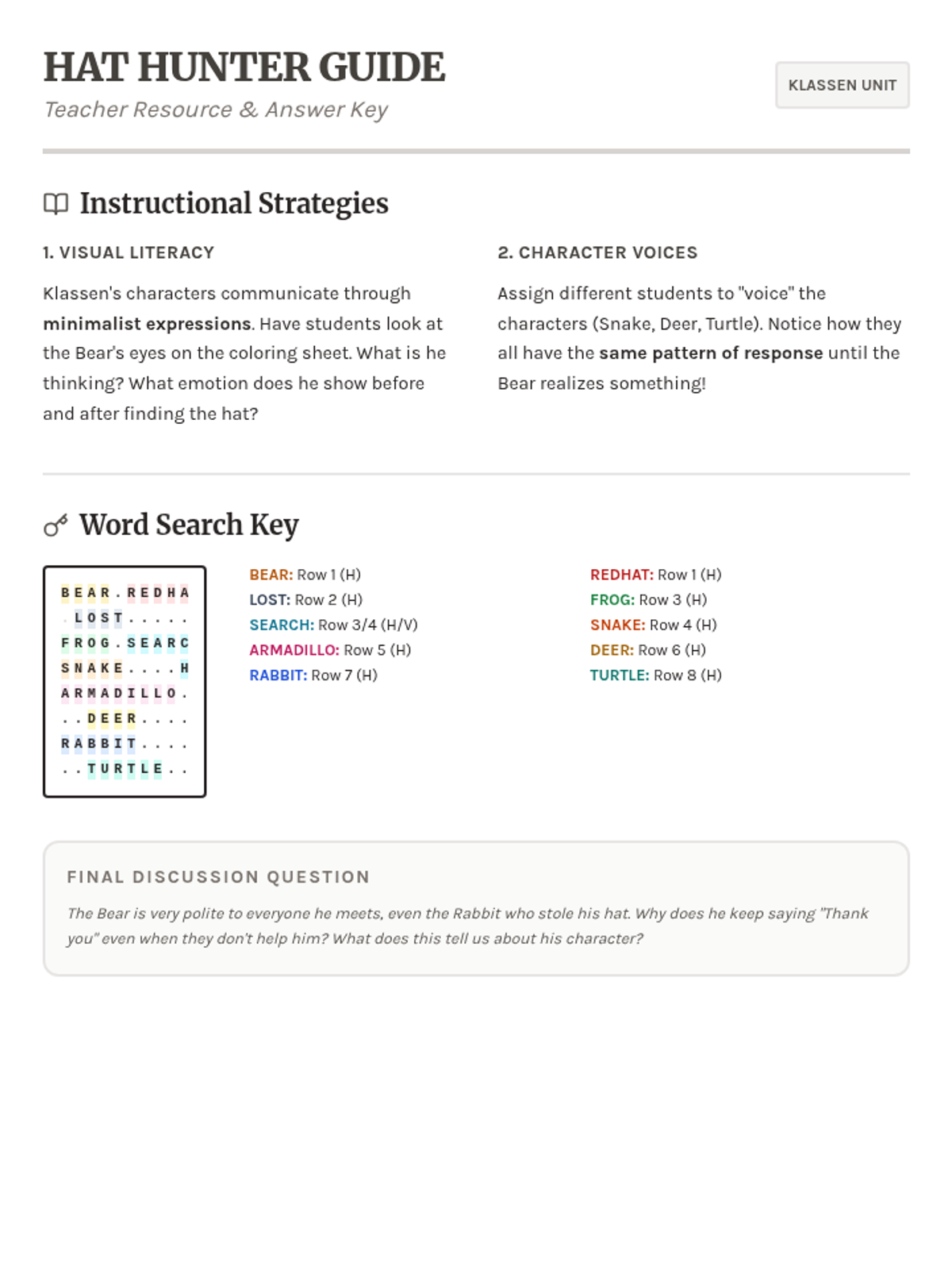 A teacher guide for the 'I Want My Hat Back' materials, including an answer key for the word search and instructional tips for visual literacy and inference. Updated for consistency with grid and characters.