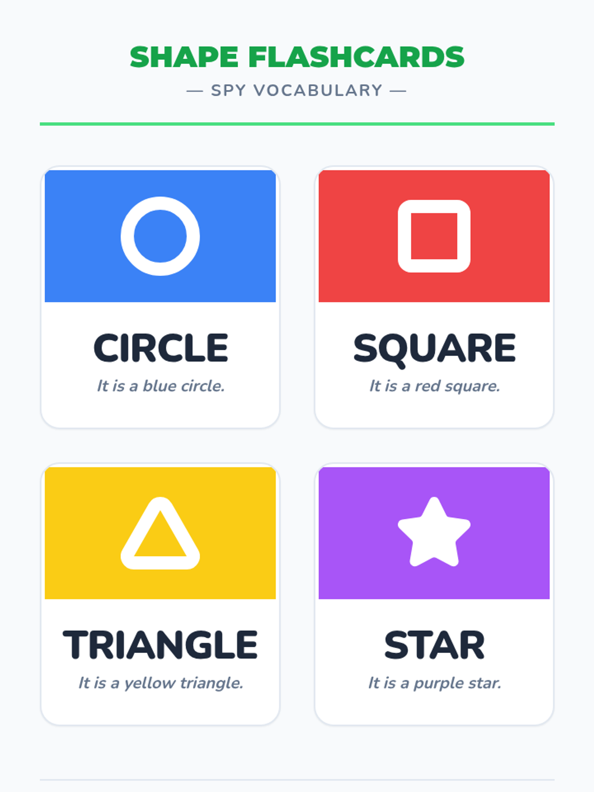 Bold shape vocabulary cards with pictorial examples and combining color/shape descriptions for early literacy support.