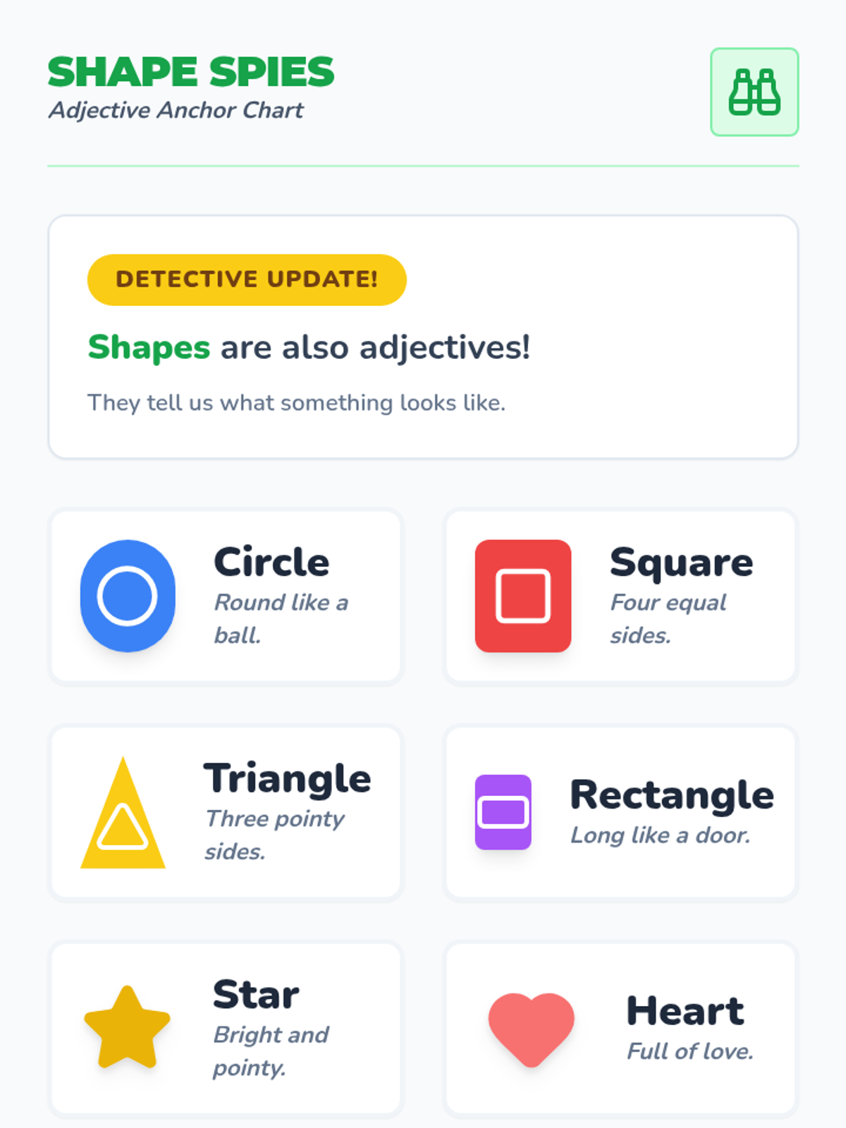 A visual anchor chart for shape adjectives, providing names and simple descriptive phrases for common geometric shapes.