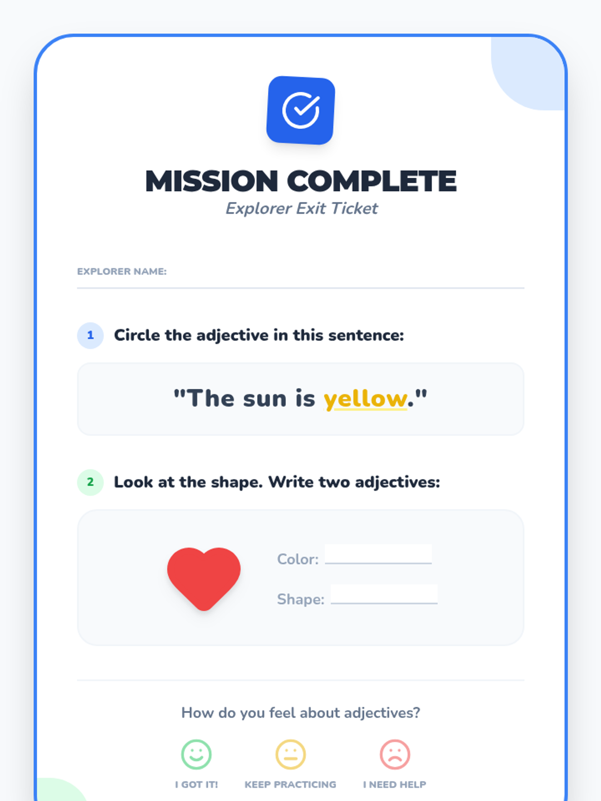 A quick check-for-understanding assessment where students identify adjectives and describe a shape using its attributes.