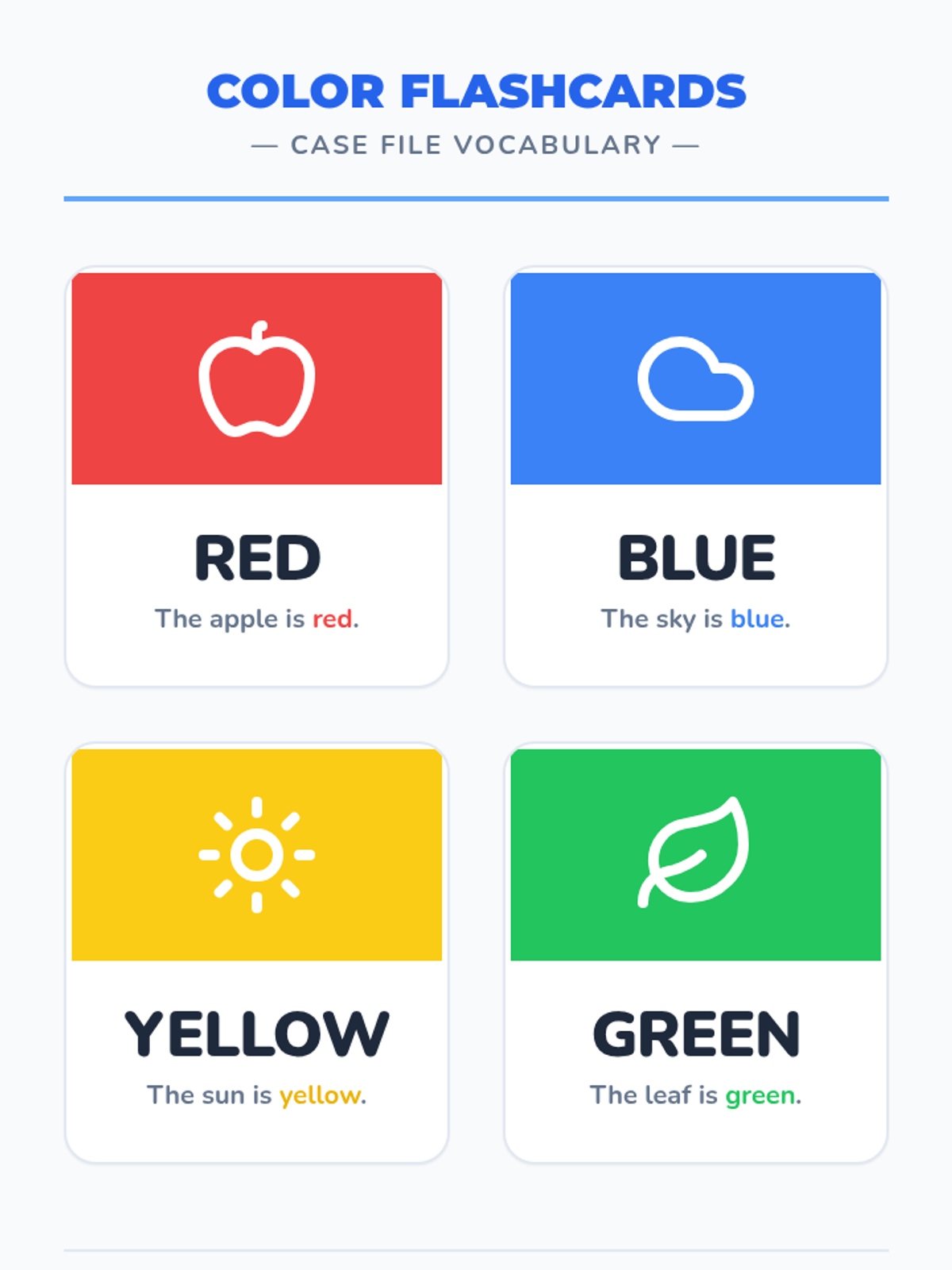 Bold color vocabulary cards with pictorial examples and simple sentence frames for early literacy support.