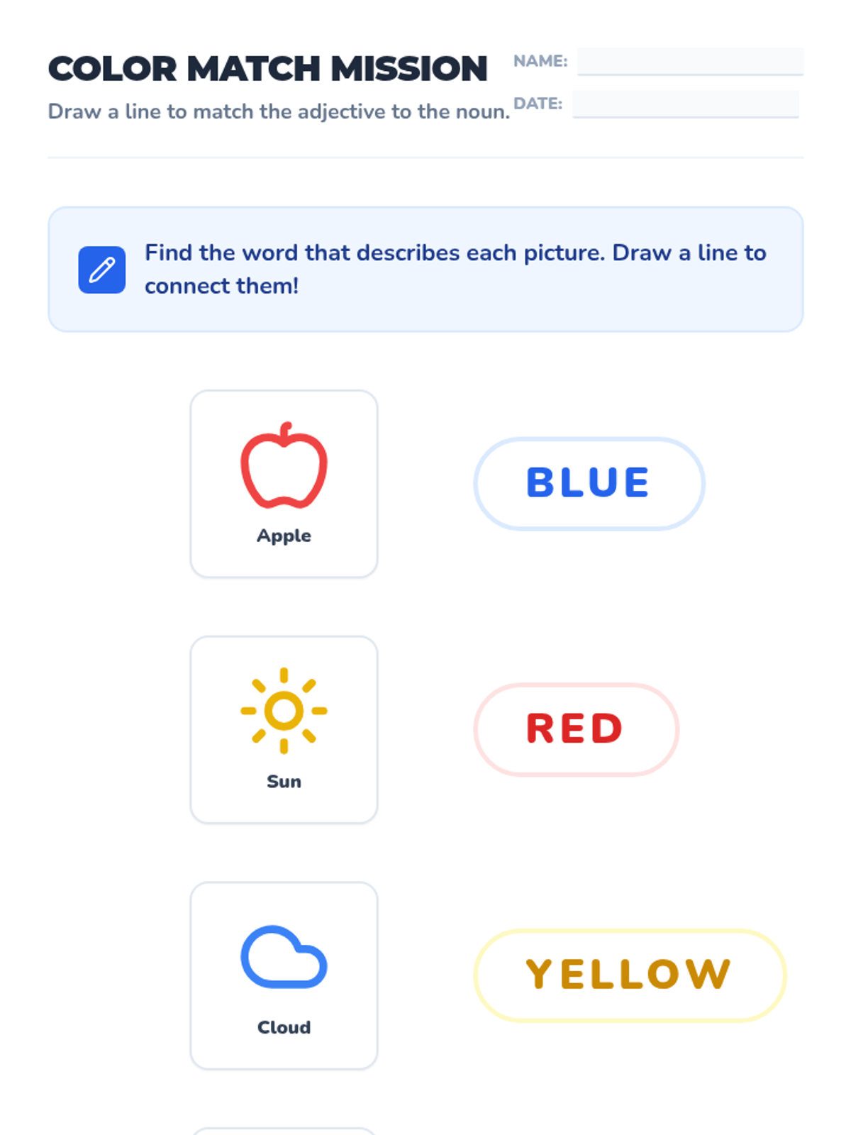 A matching worksheet where students connect color adjective words to their corresponding picture nouns.
