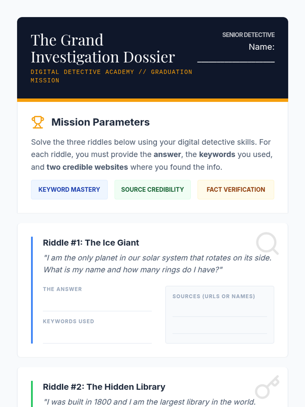 Teacher facilitation guide for the final "Grand Investigation" mission. Includes lesson timing, pairing strategies, and a detailed answer key for the scavenger hunt riddles.