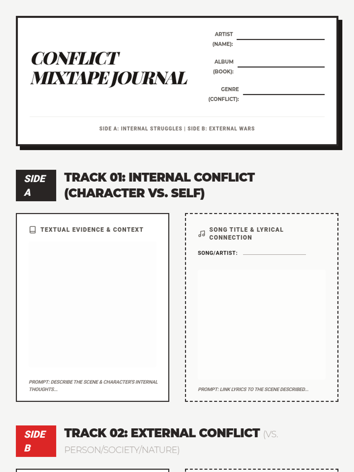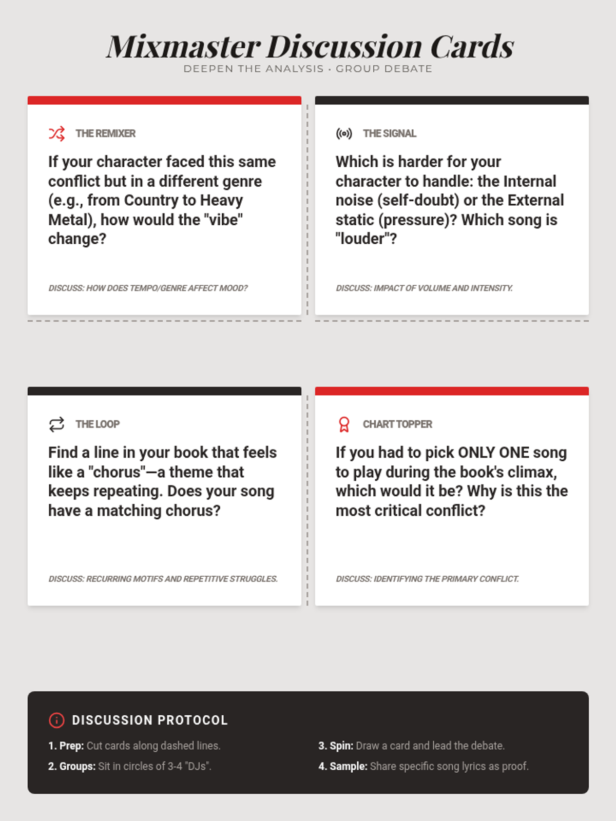 A set of engaging discussion cards for 'The Soundtrack of Conflict' lesson, prompting students to debate genre, intensity, and thematic cycles in their chosen literary soundtracks.