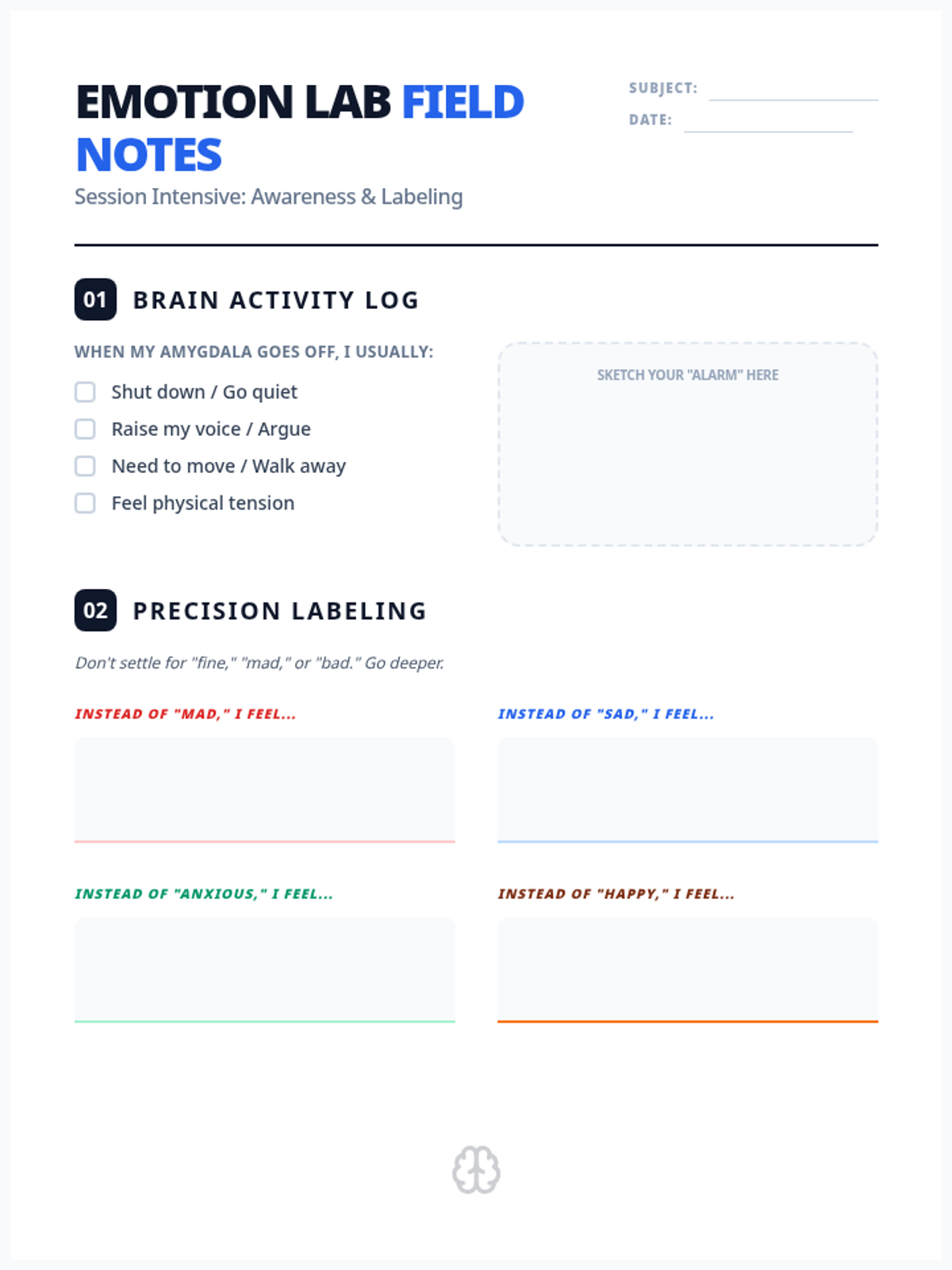 A companion worksheet for the Emotion Lab session, featuring brain activity logs, precision labeling exercises, and social story analysis for teens.