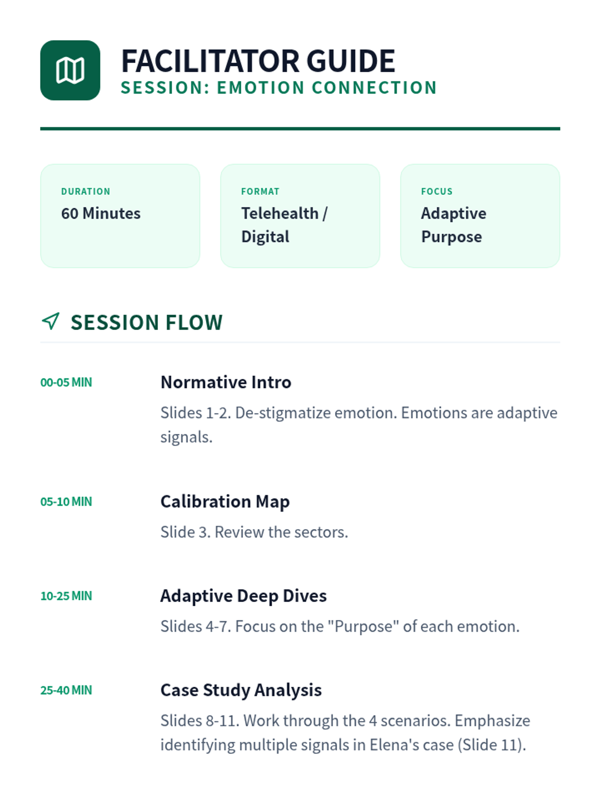 A detailed facilitator guide for the Emotion Lab session, including pacing, therapeutic strategies, and instructions for using the interactive social stories.