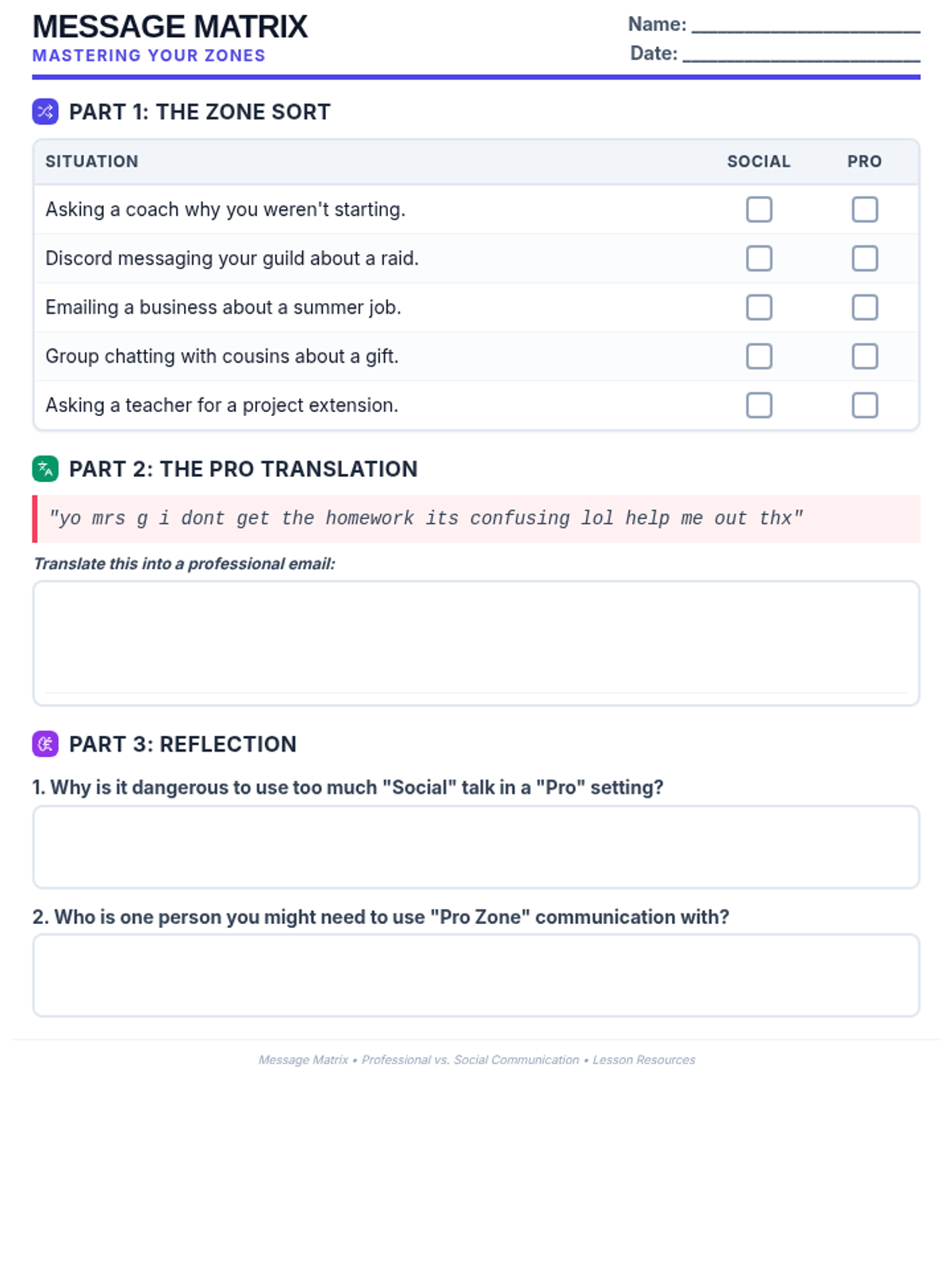 A hands-on worksheet where students practice sorting communication scenarios into Professional or Social categories, translate informal slang into formal requests, and reflect on the real-world impact of their communication choices.