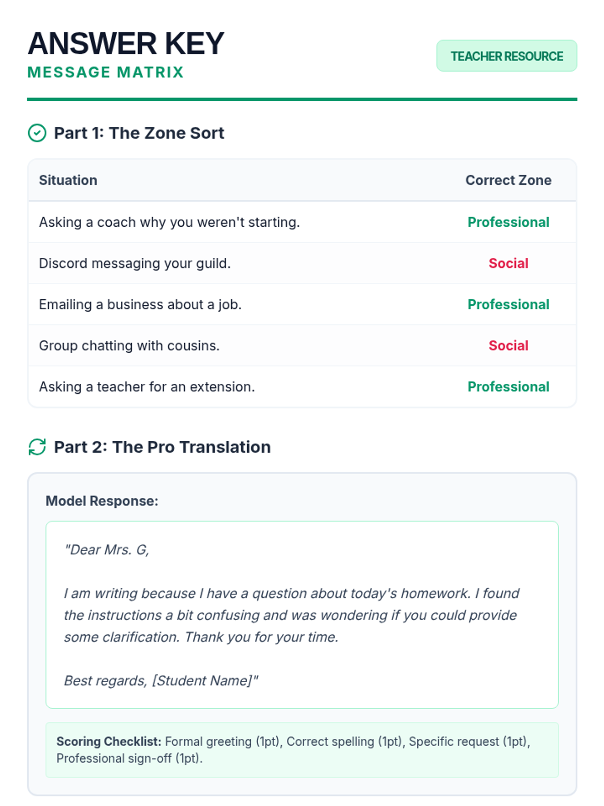 A teacher resource providing correct answers for the scenario sorting activity, a model translation for the email exercise, and a guidance key for assessing student reflection responses.