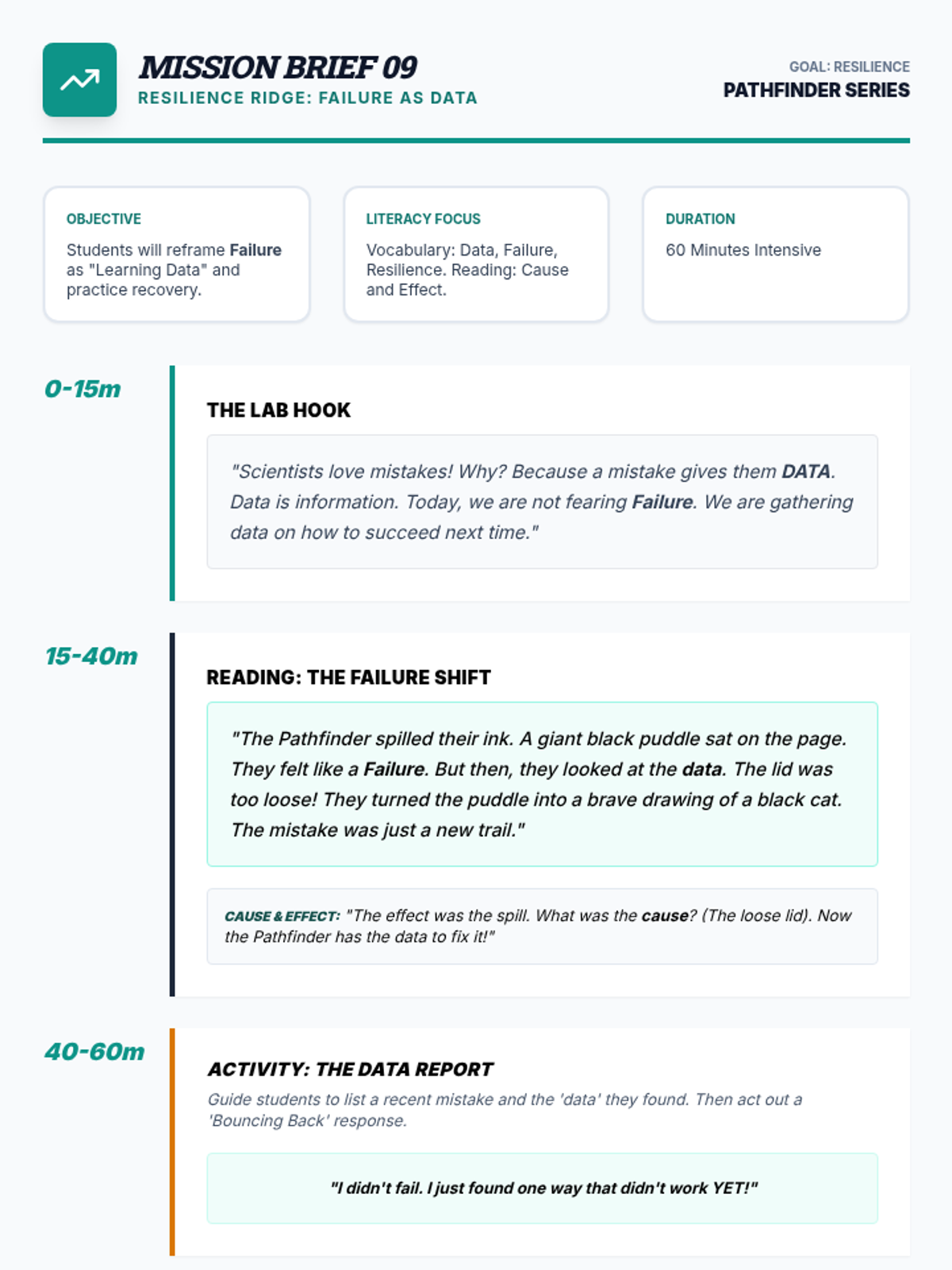 Facilitator script for Mission 09: Resilience Ridge. Teaches students to reframe failure as "learning data" and practice cause-and-effect thinking. Revised to emphasize the concept of failure as a learning opportunity. No "ninja" references.