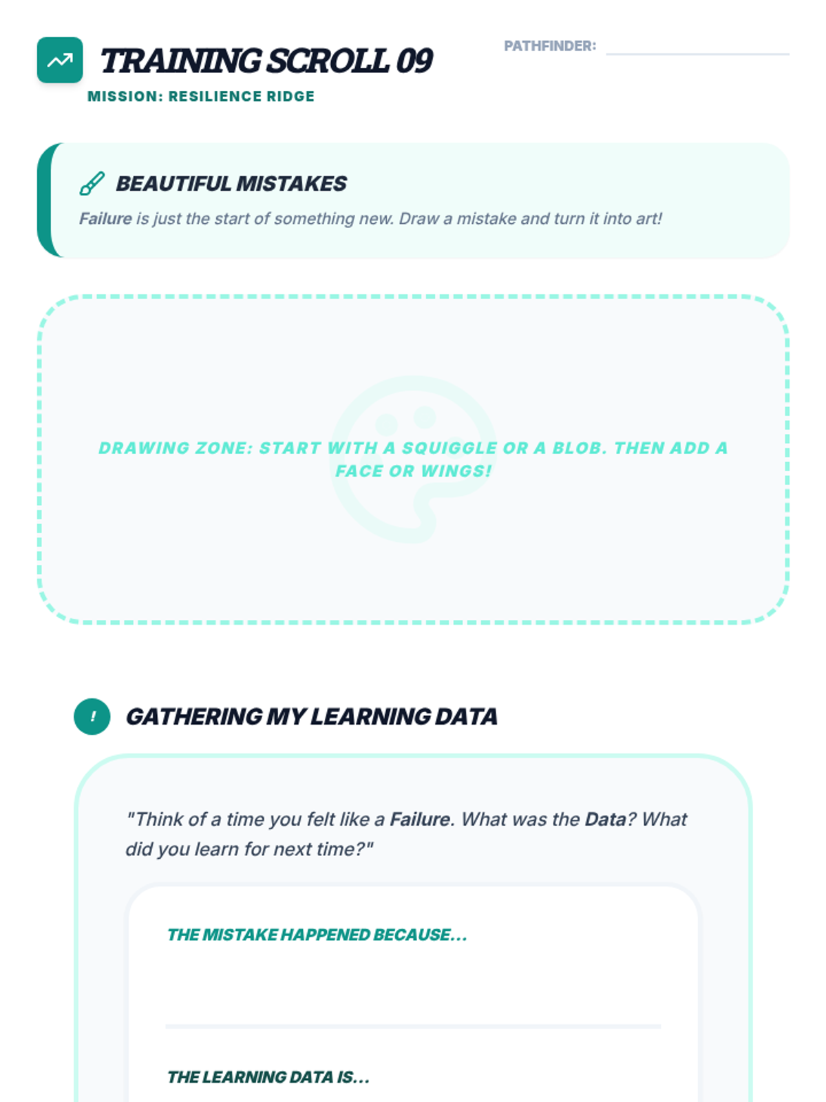 Learner workbook for Mission 09: Resilience Ridge. Features a "Beautiful Oops" drawing canvas, a "Data Collection" reflection area for learning from mistakes, and vocabulary definitions. Revised to emphasize failure as data and include vocabulary matching. No "ninja" references.