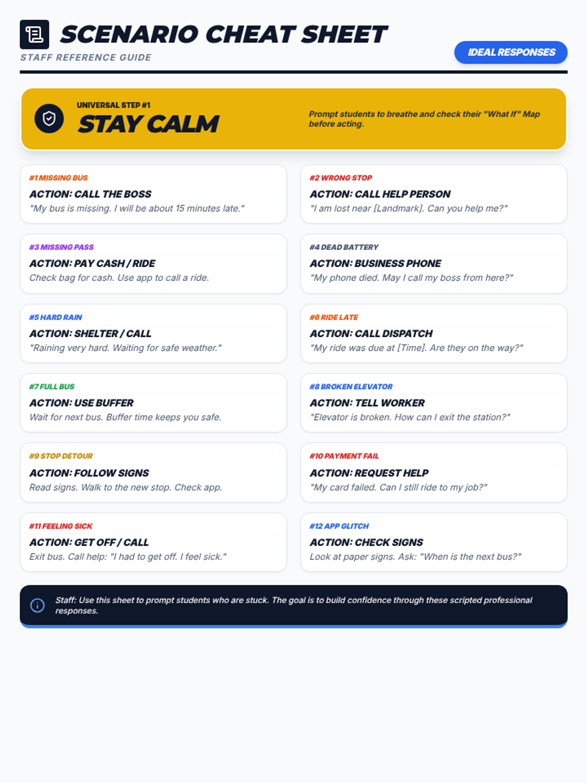 A comprehensive quick-reference cheat sheet for staff, mapping every commute challenge to the ideal professional response and sample script.
