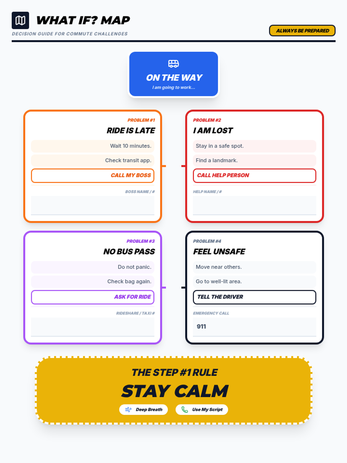 A visual decision-making map for adults with IDD to navigate common commute problems, featuring clear branching paths and step-by-step actions for remaining safe and reliable.