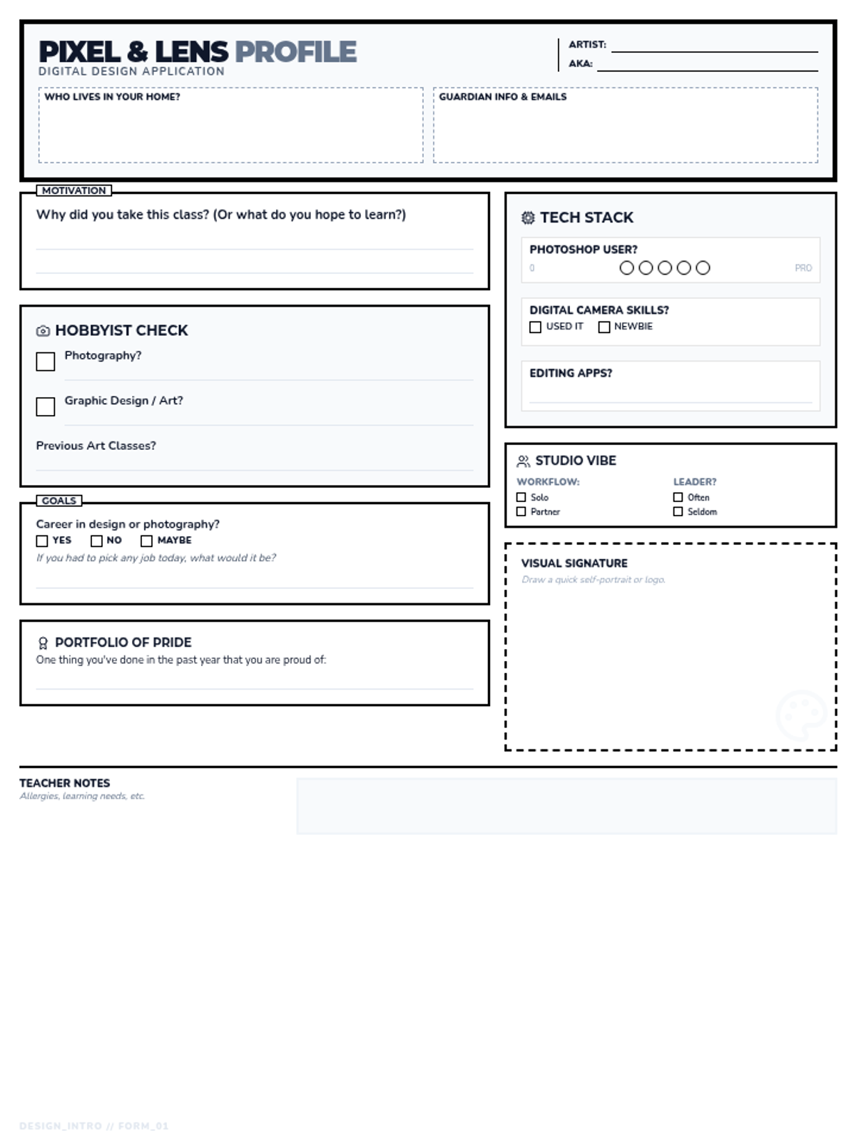 The final "Principles of Digital Design" student application worksheet. Features a sticker-style name tag, a large drawing area at the top, expanded motivation questions, and specific technical skill trackers. Optimized for single-page use.