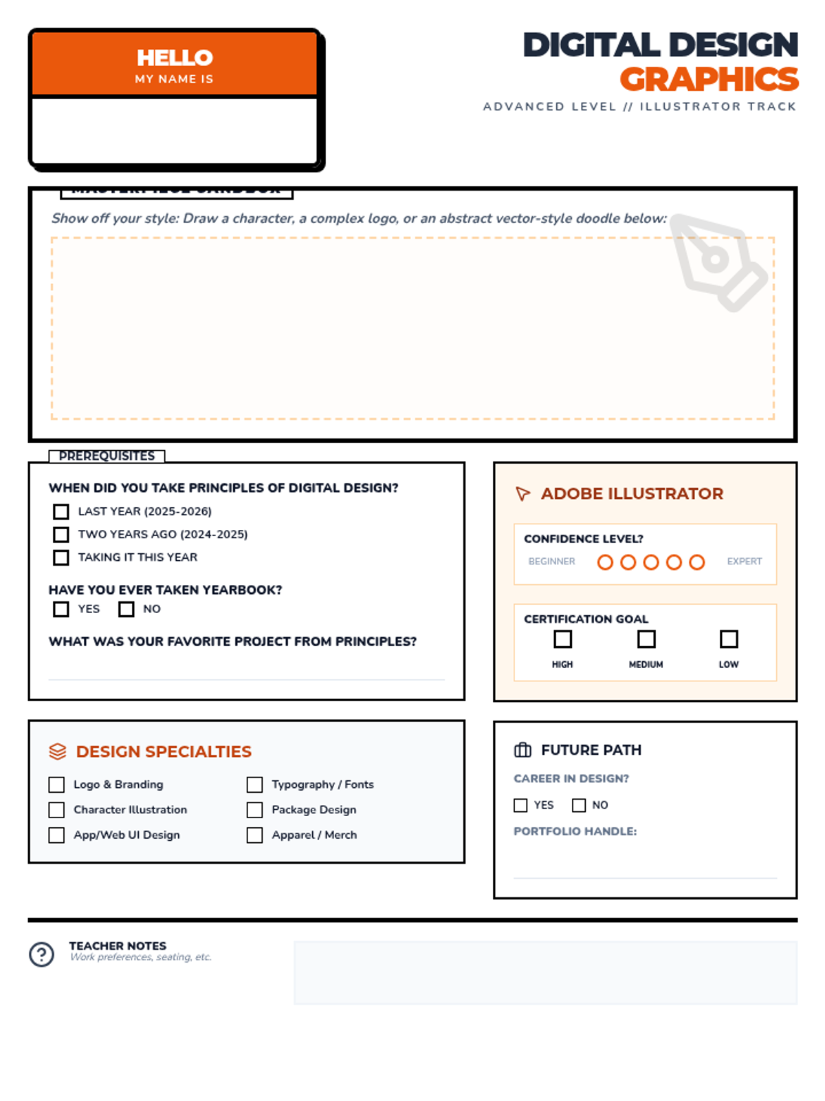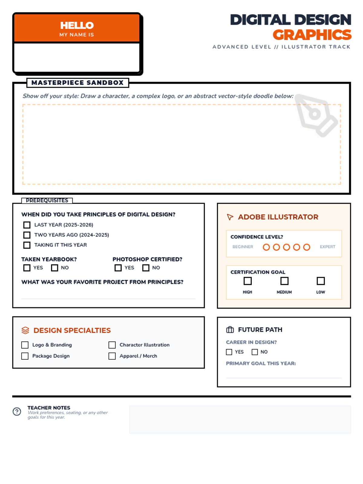 A redesigned Digital Design class application featuring a "Hello My Name Is" sticker header, a prominent drawing area at the top, and specific questions about student motivation and tech skills. Optimized for single-page printing without family/guardian fields.