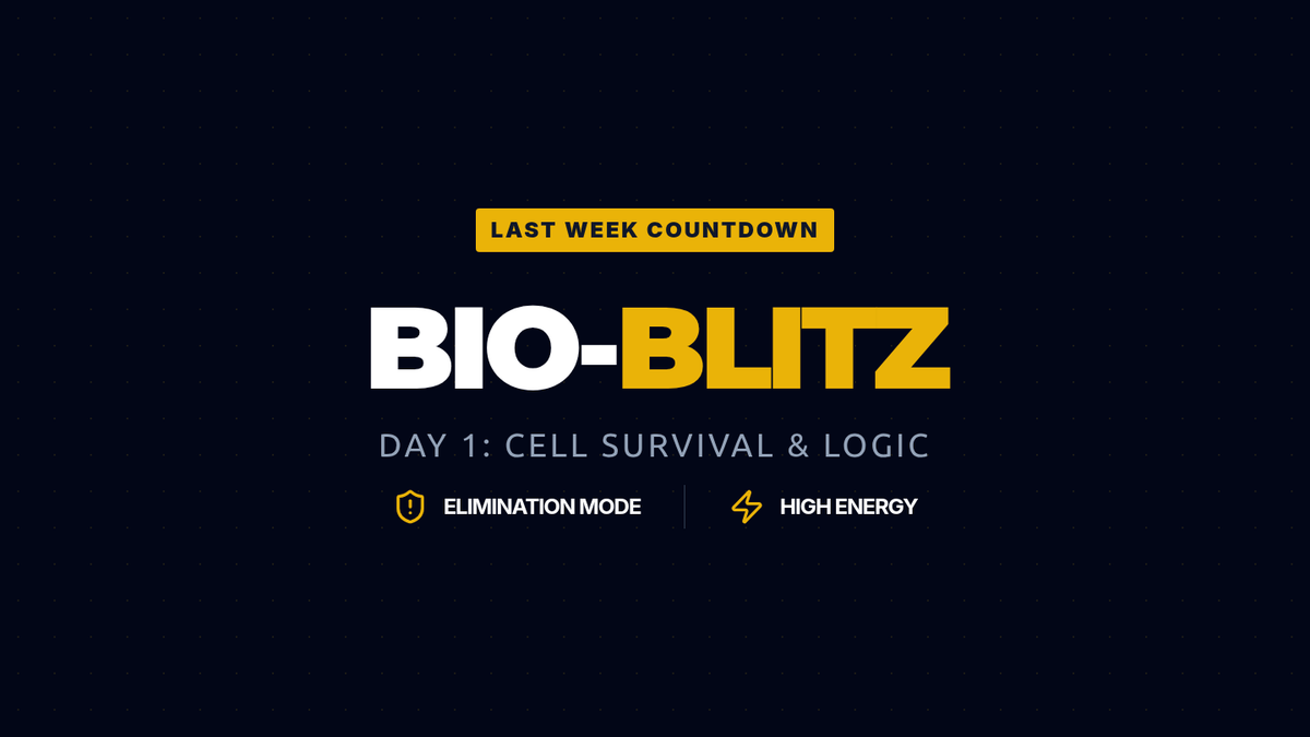 Day 1 Slides for the Bio-Blitz review. Revised to include a practice question, fix text contrast on the DRY MIX slide, increase icon visibility, and ensure correct spacing.
