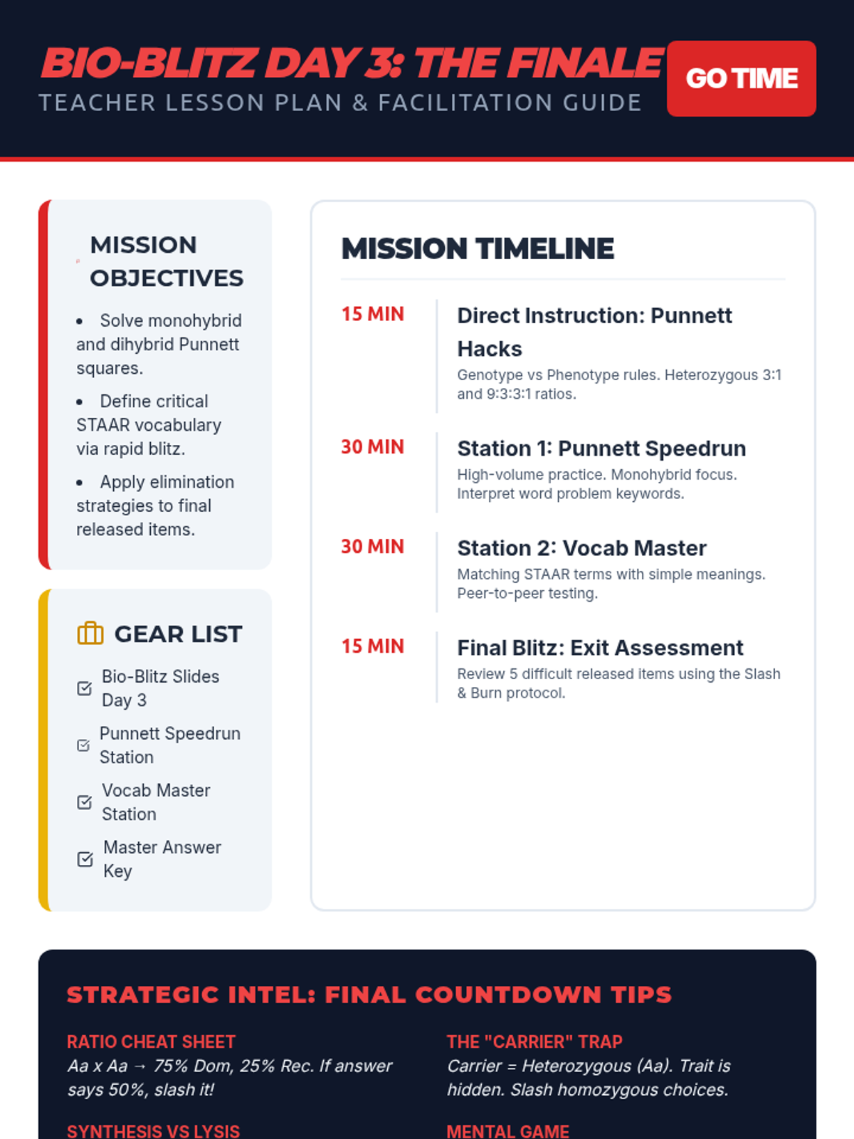A detailed lesson plan for Day 3 of the Bio-Blitz review. Revised to fix timeline page breaks, improve content density, and remove minor visual artifacts.