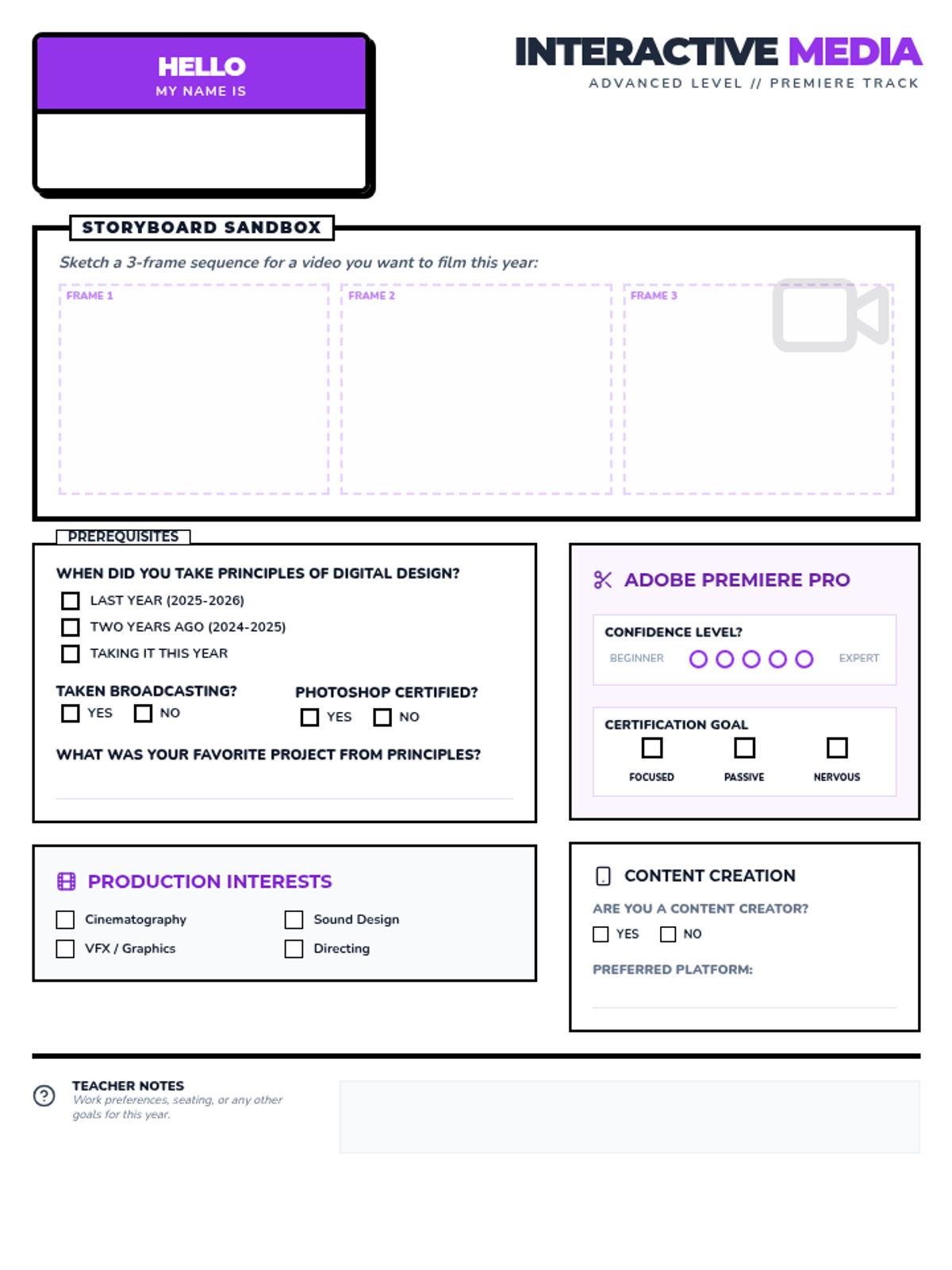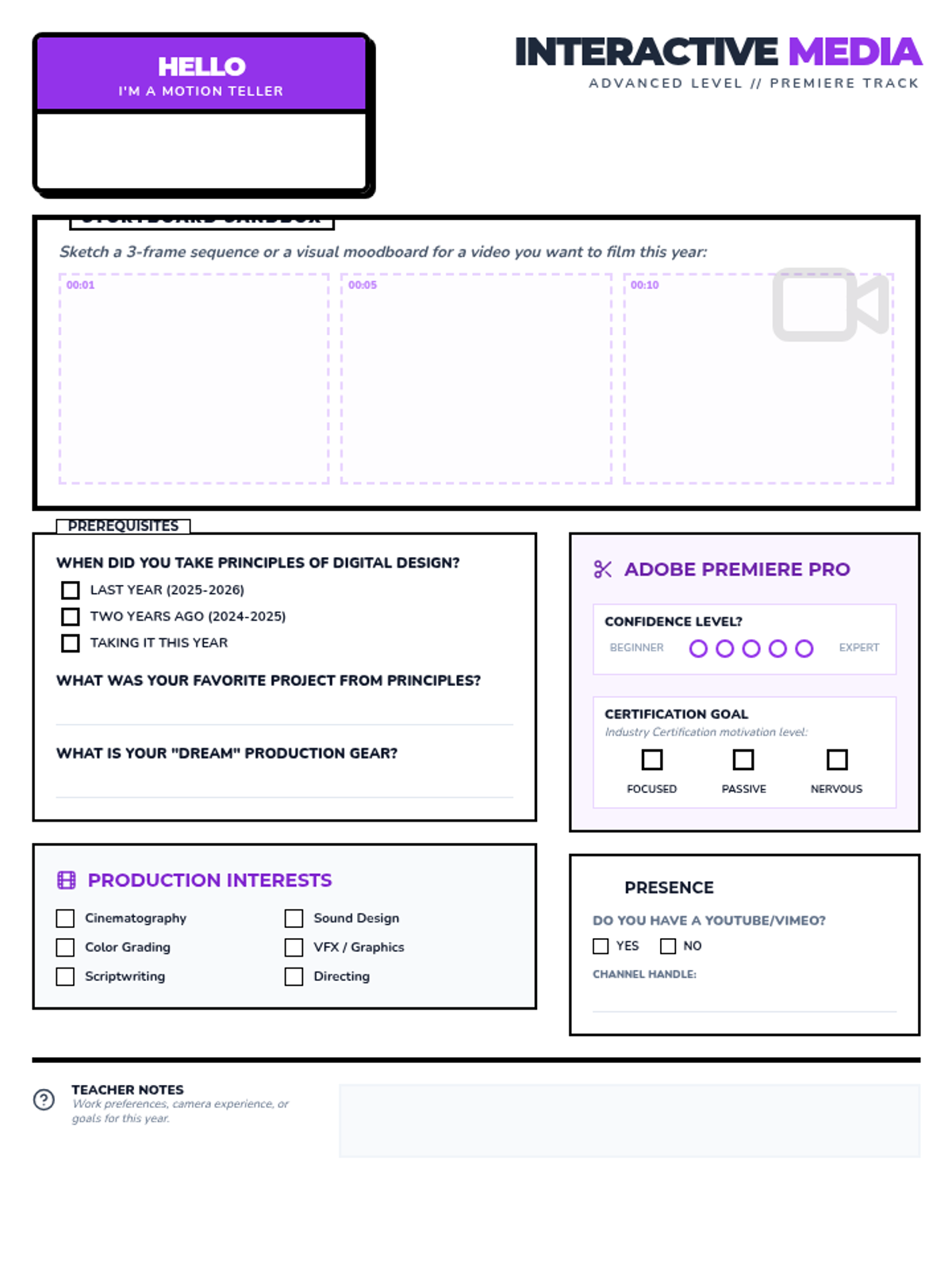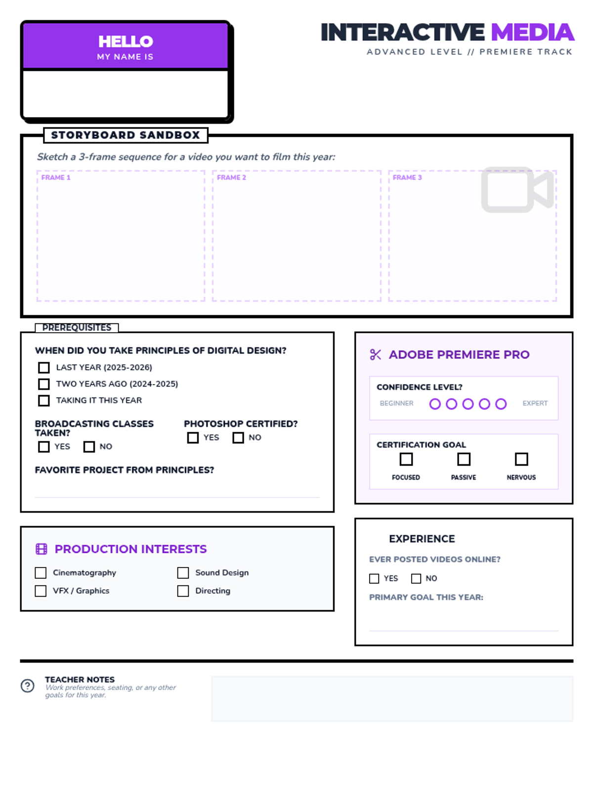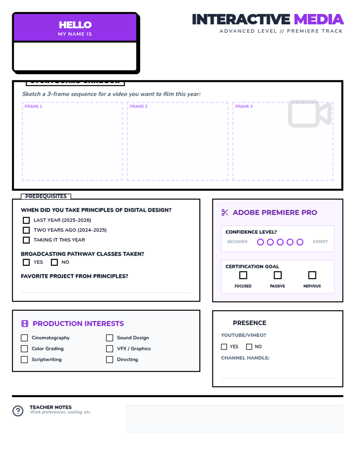 A specialized application worksheet for advanced Interactive Media students focusing on Adobe Premiere Pro certification. Includes a question about when they took the prerequisite 'Principles of Digital Design' course and if they have taken Broadcasting.