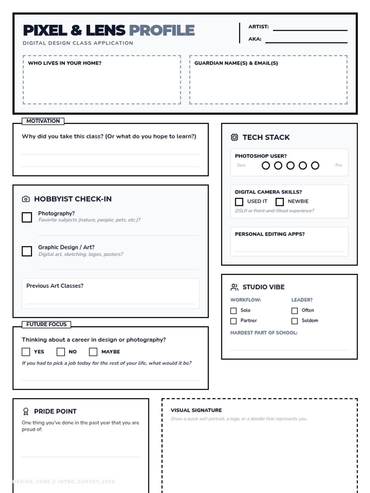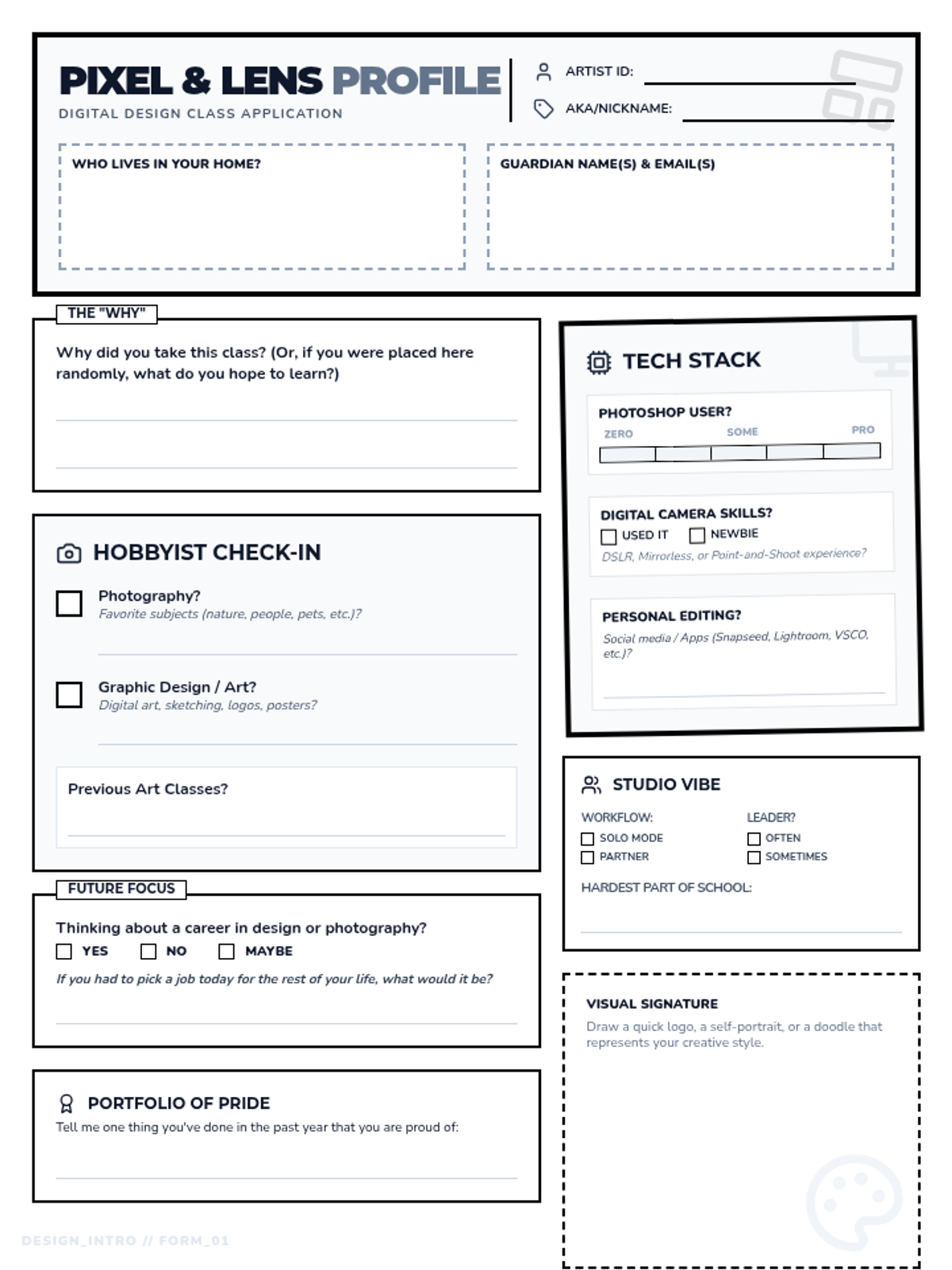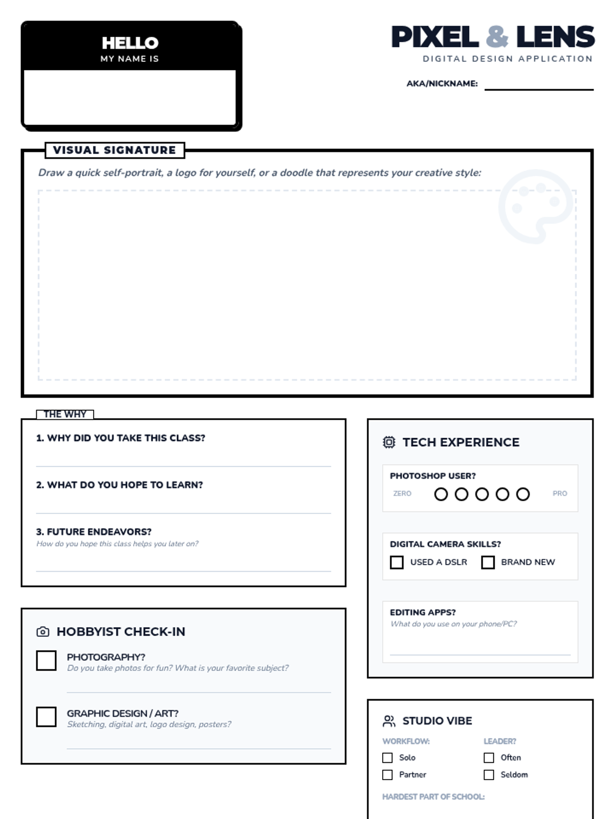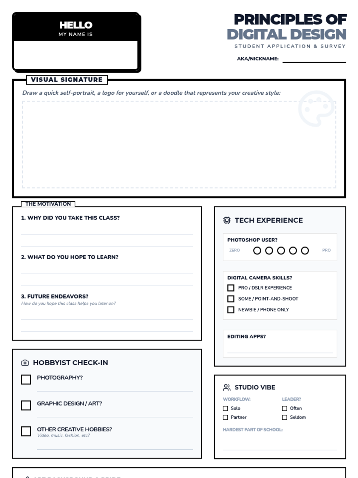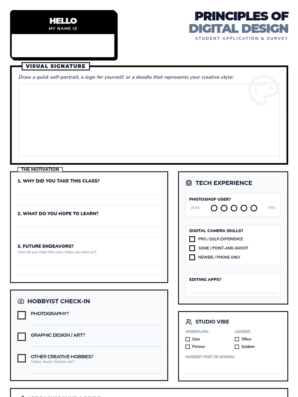 A refined student application worksheet for 'Principles of Digital Design'. Includes more writing space for motivation, three levels of camera experience, and a dedicated section for various creative hobbies, while maintaining the name tag header and visual signature area.