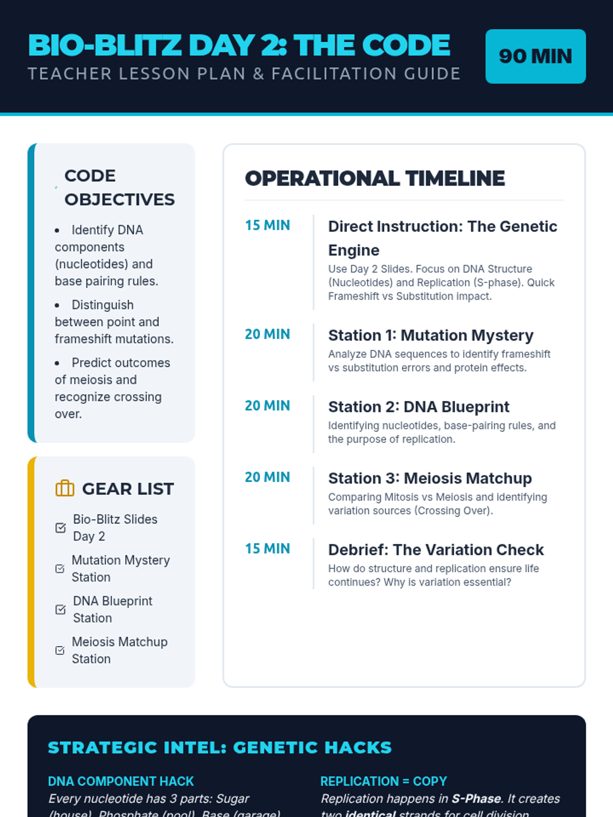 A detailed lesson plan for Day 2 of the Bio-Blitz review. Revised to include DNA Structure and Replication objectives and a 3-station rotation schedule.