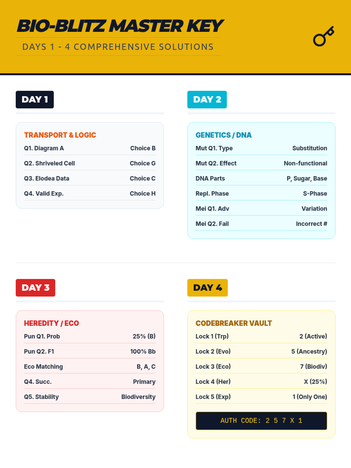 A comprehensive answer key for all station activities across the 4-day Bio-Blitz sequence. Revised to fix Day 1 numbering, increase Auth Code font size for better contrast, and improve section labeling.