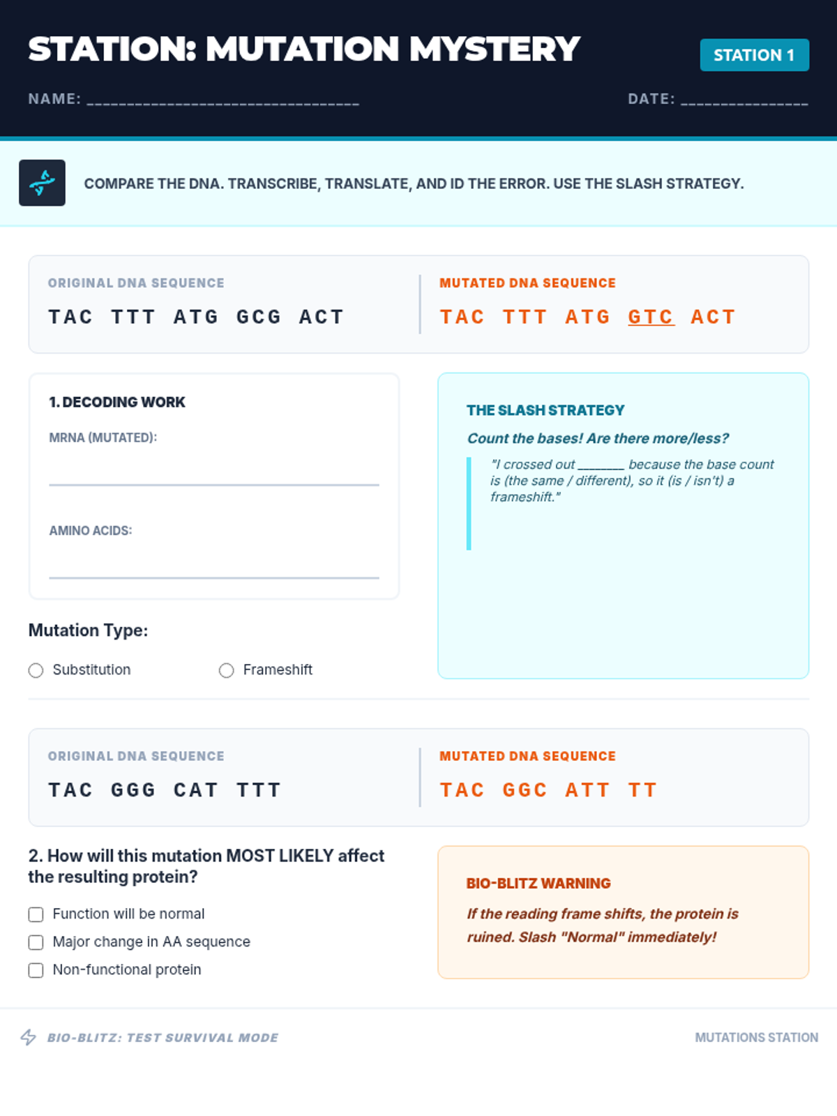 A student station worksheet for Day 2 focused on analyzing DNA mutations. Revised to fix page breaks, correct DNA sequences to match mutation types, vertically align sequences, and increase work area space.