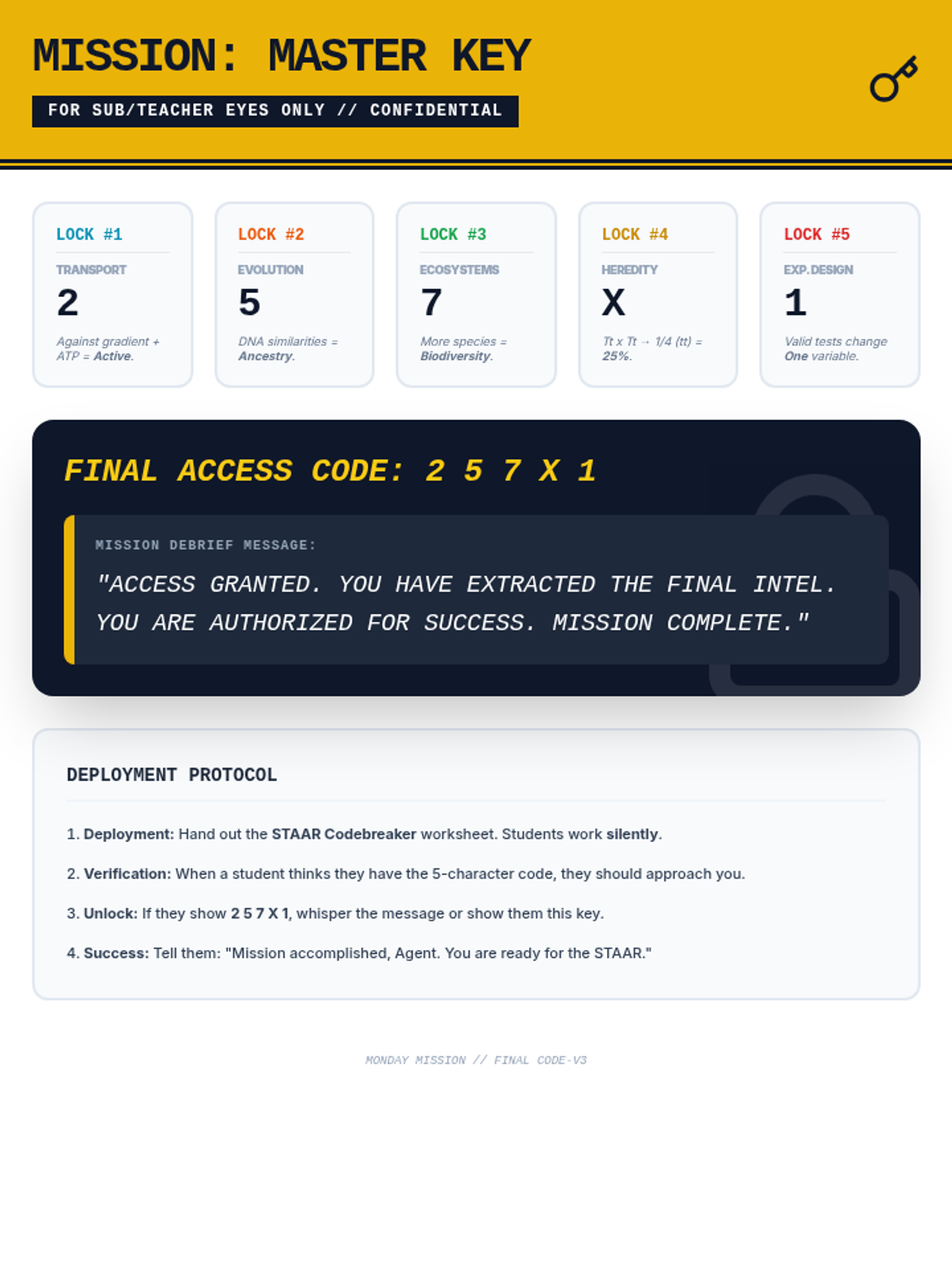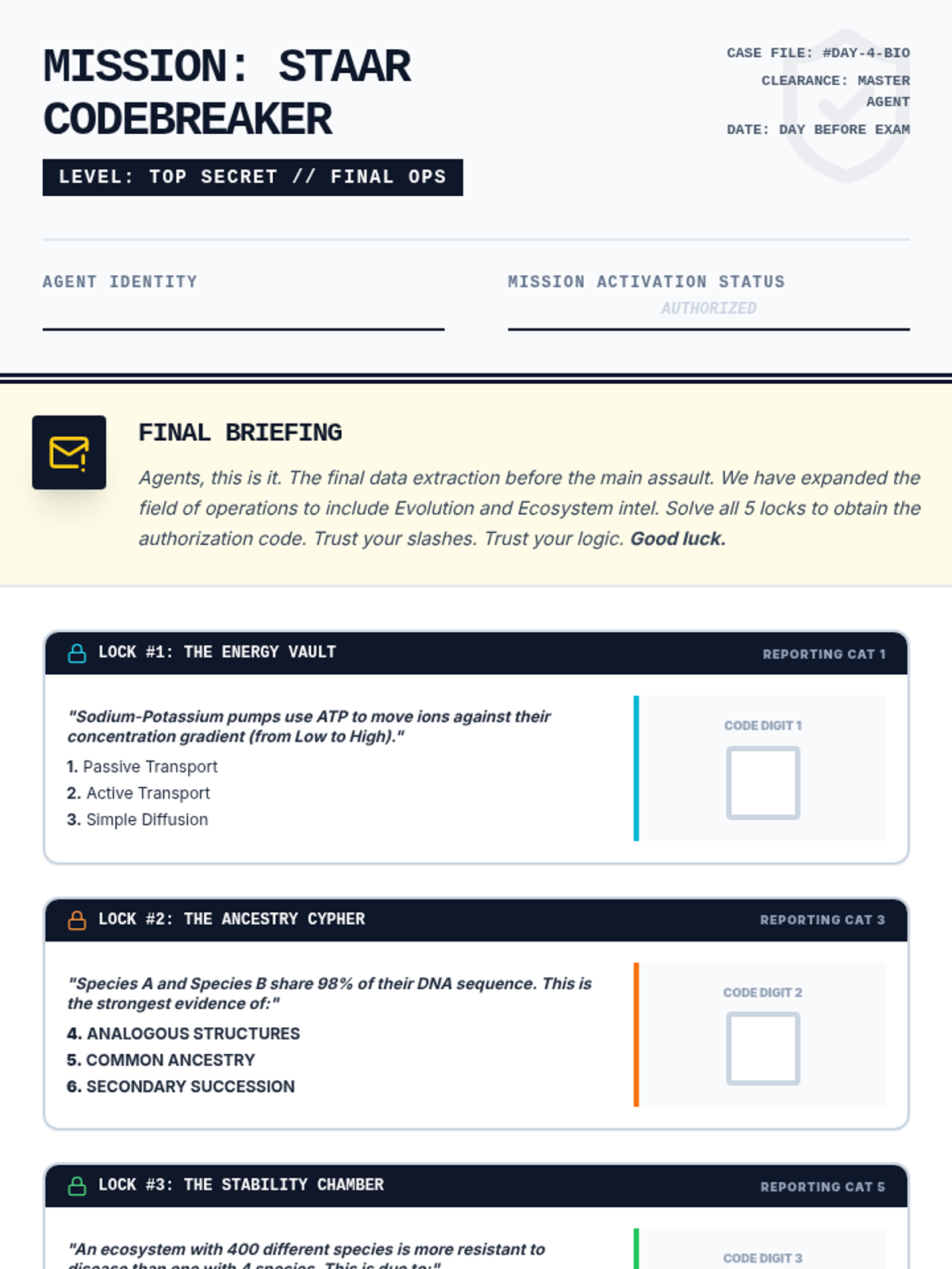 A robust, independent "Secret Agent" themed review worksheet for the day before the STAAR exam. Students solve five biology-based locks (transport, evolution, ecosystem stability, heredity, experimental design) to find a final 5-digit code. Revised to fix layout overlap and integrate new topics.