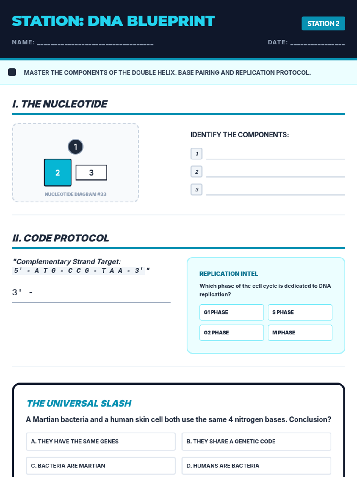 A station activity for Day 2 focused on DNA structure (nucleotides) and replication. Includes base-pairing practice, cell cycle phase identification, and the concept of the universal genetic code. Revised to fix answer choice styling and student work area visibility.