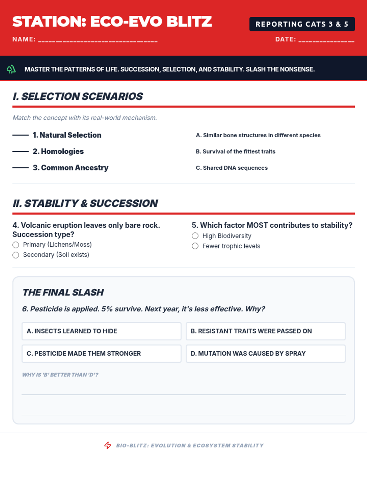 A station activity for Day 3 focused on Evolution and Ecosystem Stability. Includes Natural Selection scenarios, succession identification, and biodiversity logic. Revised to fit on one page and provide clearer writing areas.