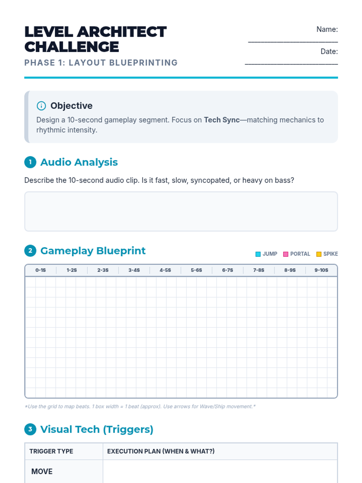A level design project worksheet where students blueprint a 10-second segment of a Geometry Dash level, focusing on rhythm sync and trigger logic.