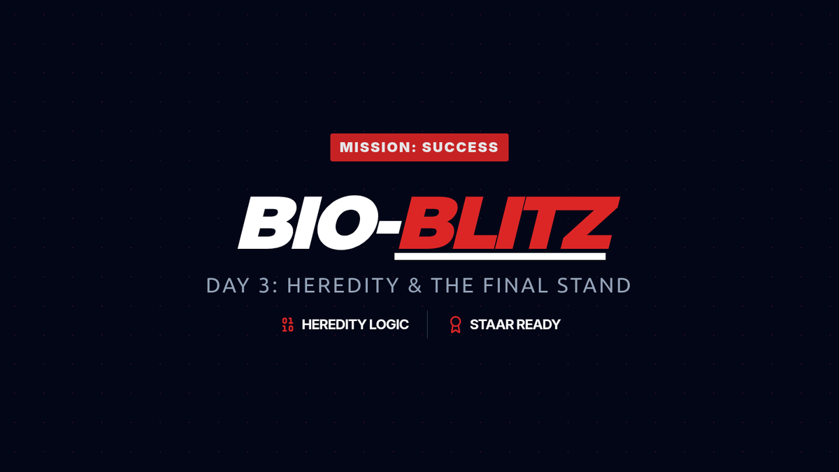 Day 3 Slides for the Bio-Blitz review. Revised to fix text contrast, improve icon visibility on the vocab slide, and enhance emphasis words on the protocol slide.