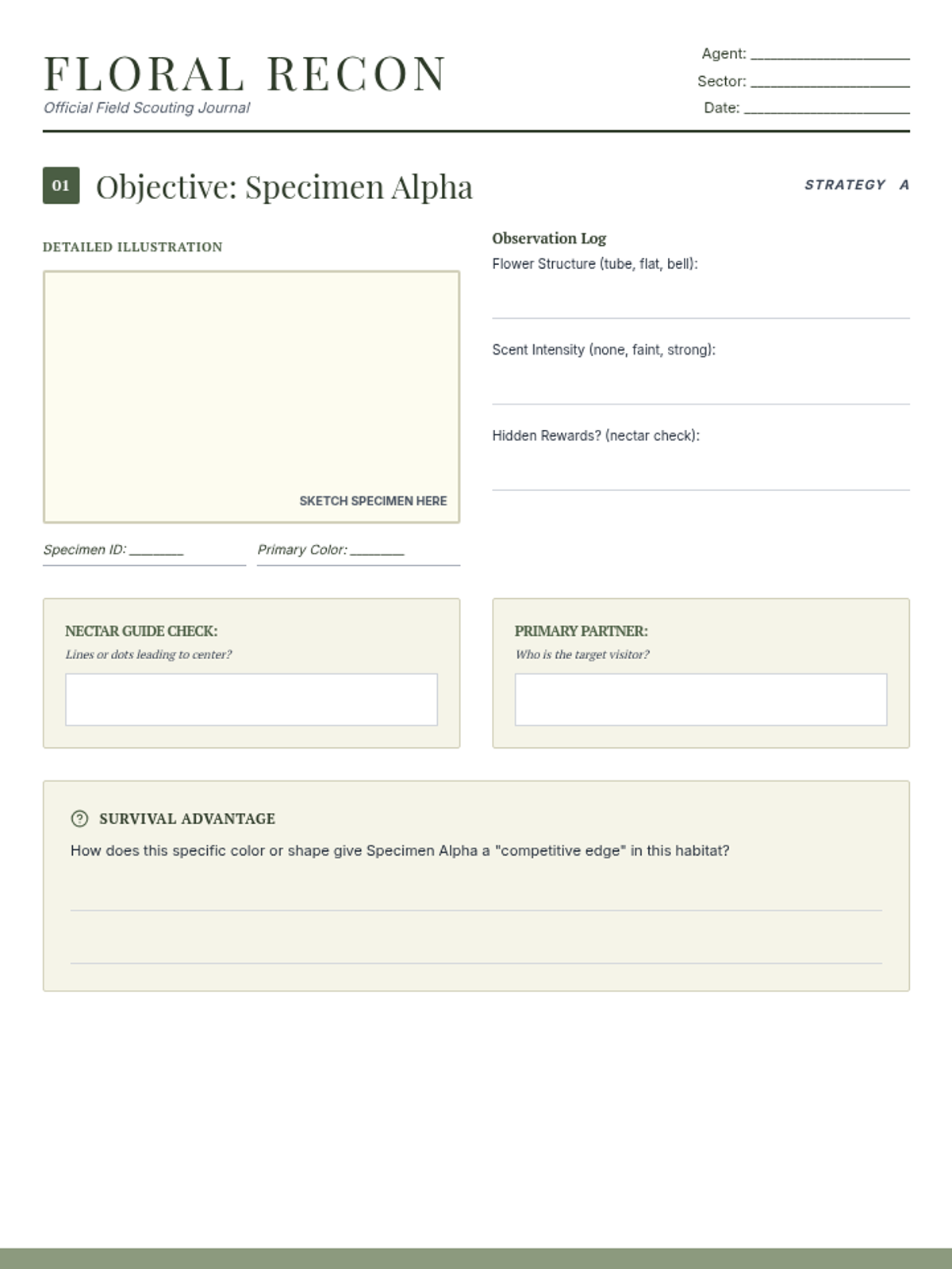 A two-page student field journal designed for sketching and analyzing two distinct flowering specimens. Focuses entirely on pollination attraction strategies and partnerships. Revised for consistency and better layout.