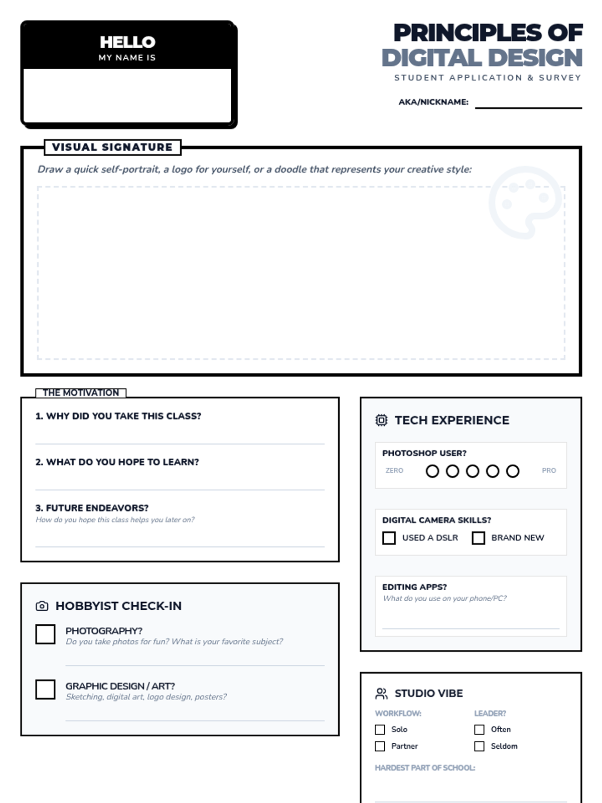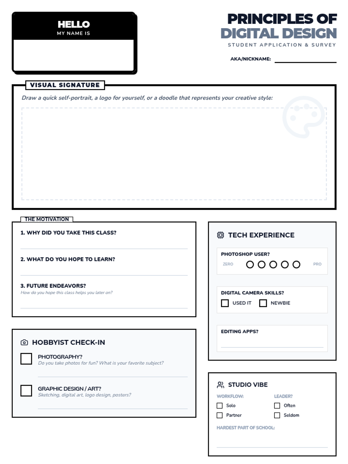 A creative class application worksheet renamed to "Principles of Digital Design". It features a name tag header, a large drawing signature area, and targeted questions on motivation, tech skills, and learning preferences.