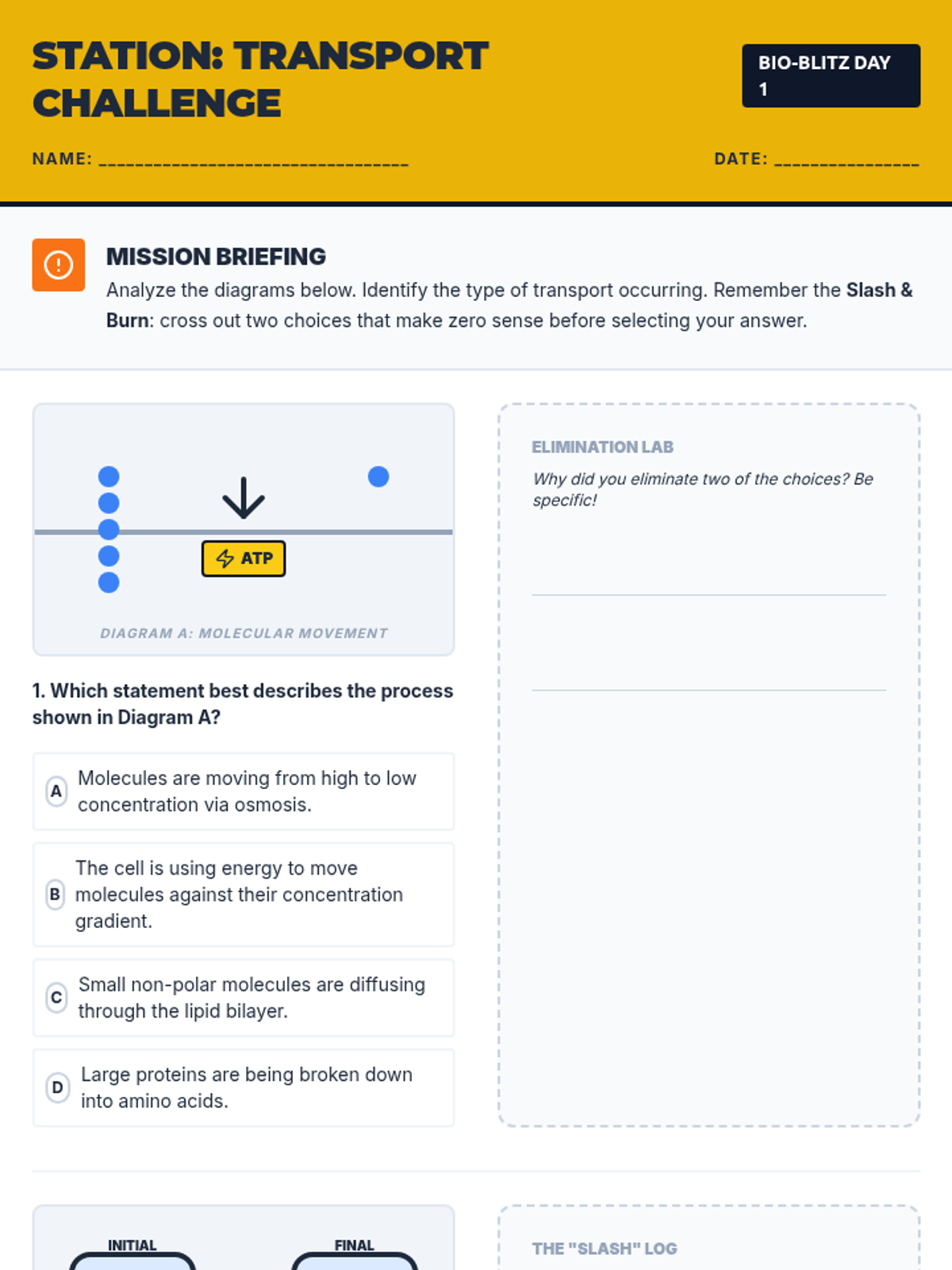 A station activity for Day 1 where students analyze cell transport diagrams. Revised to fix page breaks, improve diagram clarity, and provide more student work space.