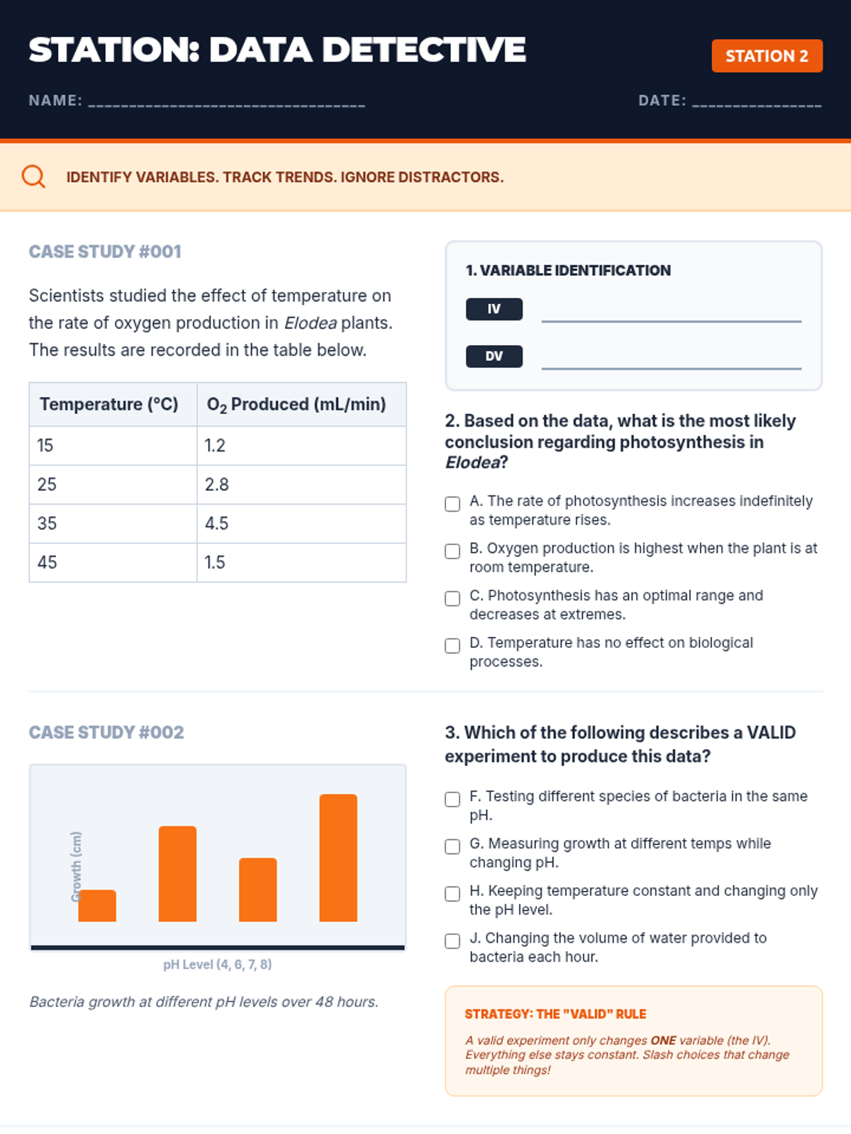 A station activity for Day 1 focused on data analysis. Revised to renumber questions correctly and condense to a single page for better usability.