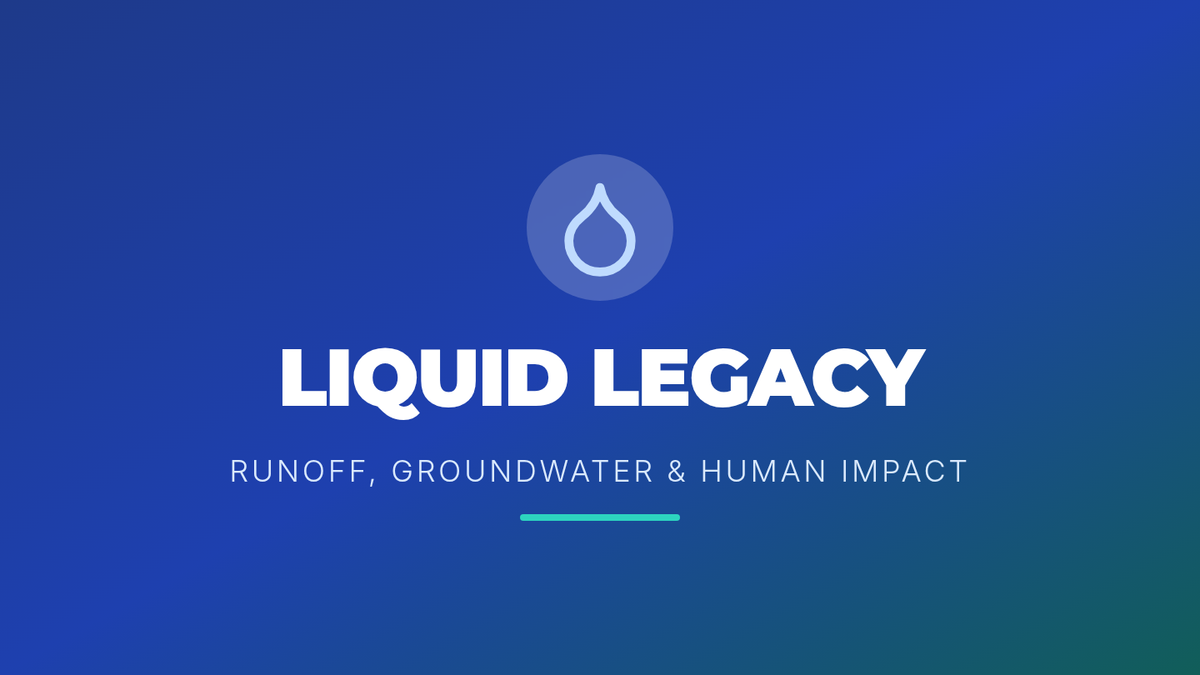 A 5-slide visual presentation reviewing the concepts of runoff and groundwater, with a focus on human impact and pollution pathways. It features clean typography and diagrams explaining infiltration and pollution sources.