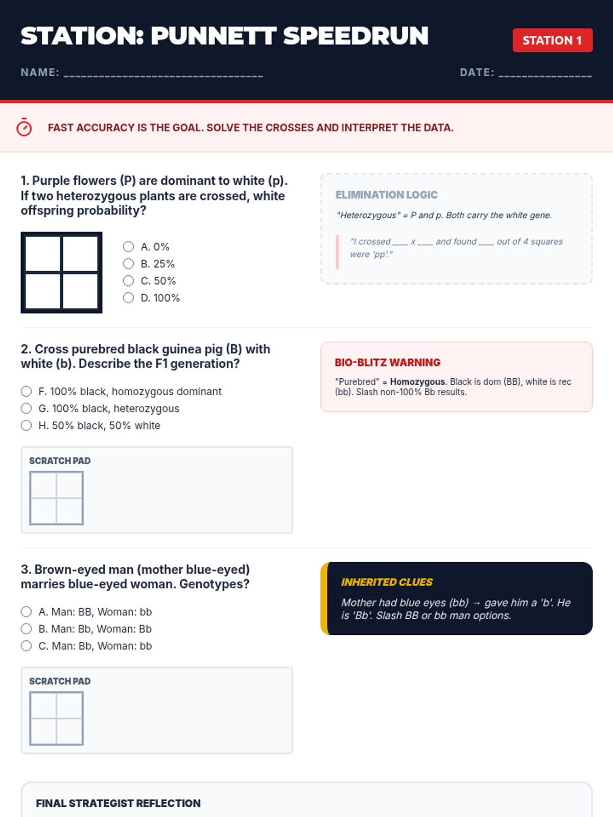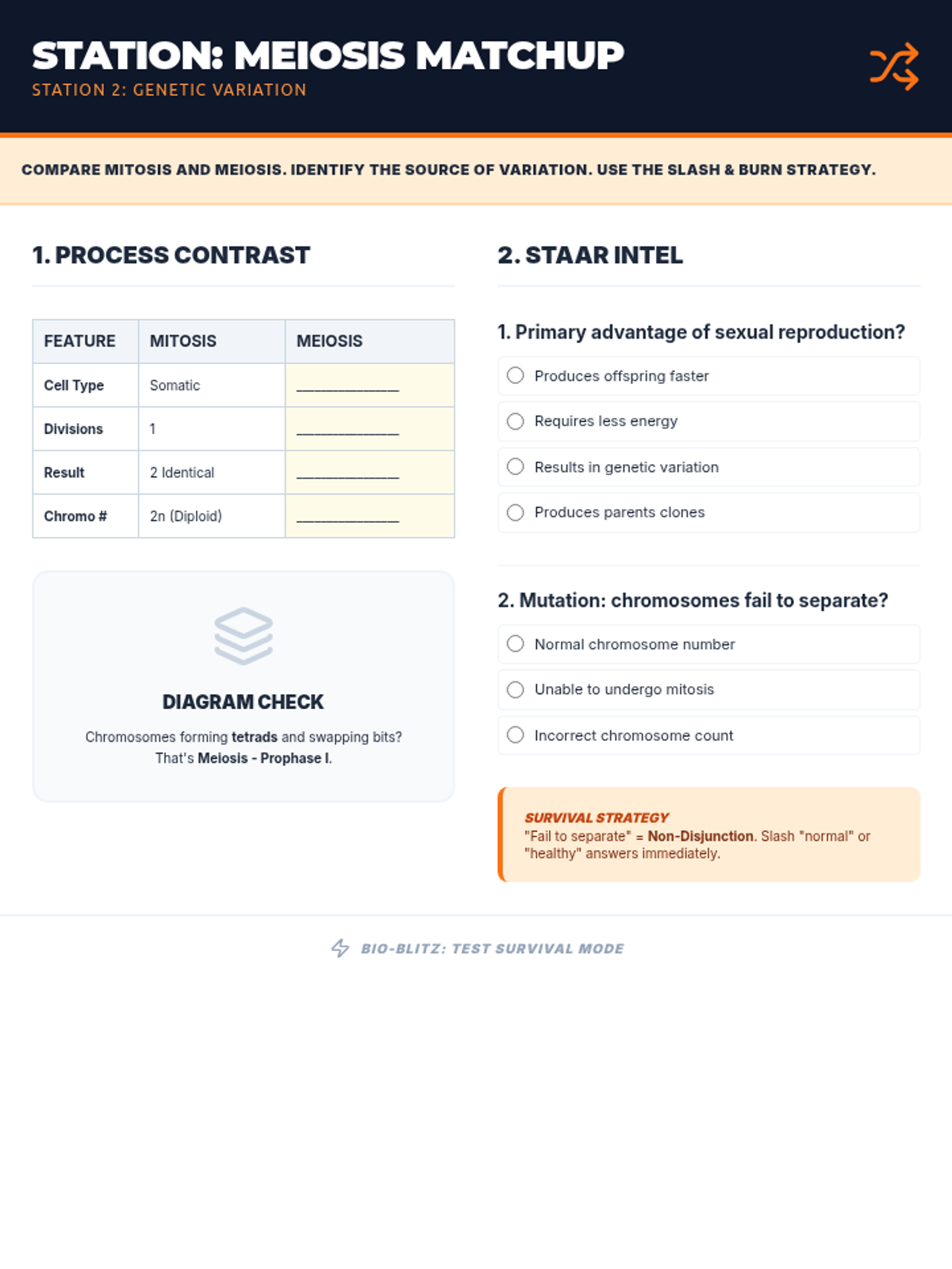 A station activity for Day 2 focused on meiosis. Revised to fix answer choice styling uniformity, resolve page breaks, increase handwriting space in the table, and improve text contrast in the header.