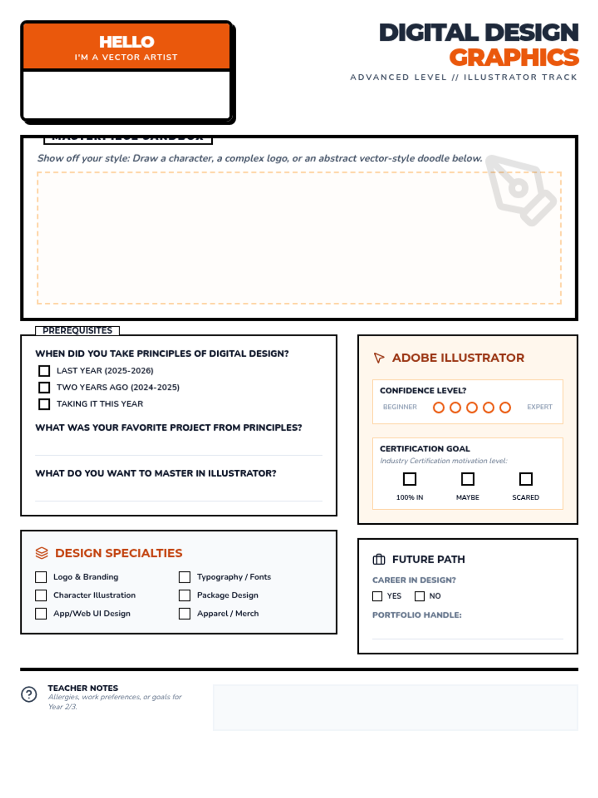 A specialized application worksheet for advanced Digital Design Graphics students focusing on Adobe Illustrator certification. Includes a question about when they took the prerequisite 'Principles of Digital Design' course and if they have taken Yearbook.