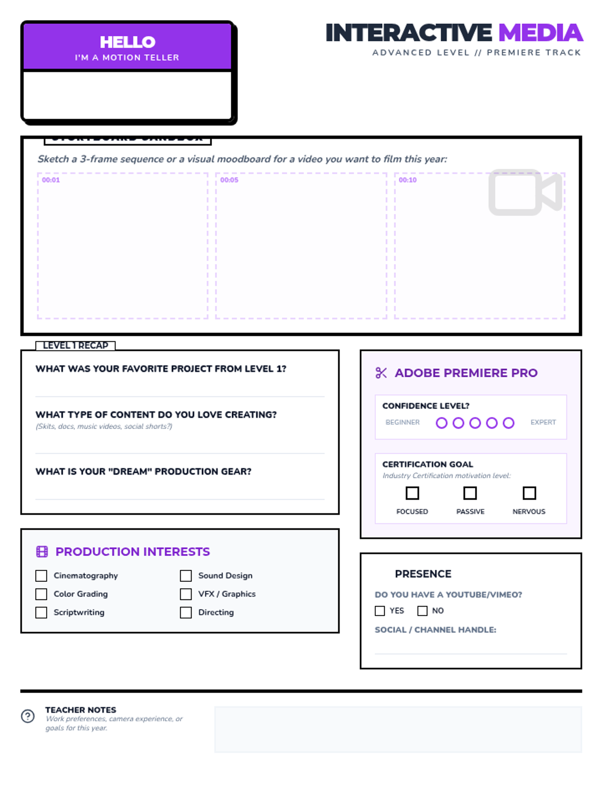 A specialized application worksheet for advanced Interactive Media students focusing on Adobe Premiere Pro certification. Features timeline-themed visuals, storyboard panels, and production interest trackers.