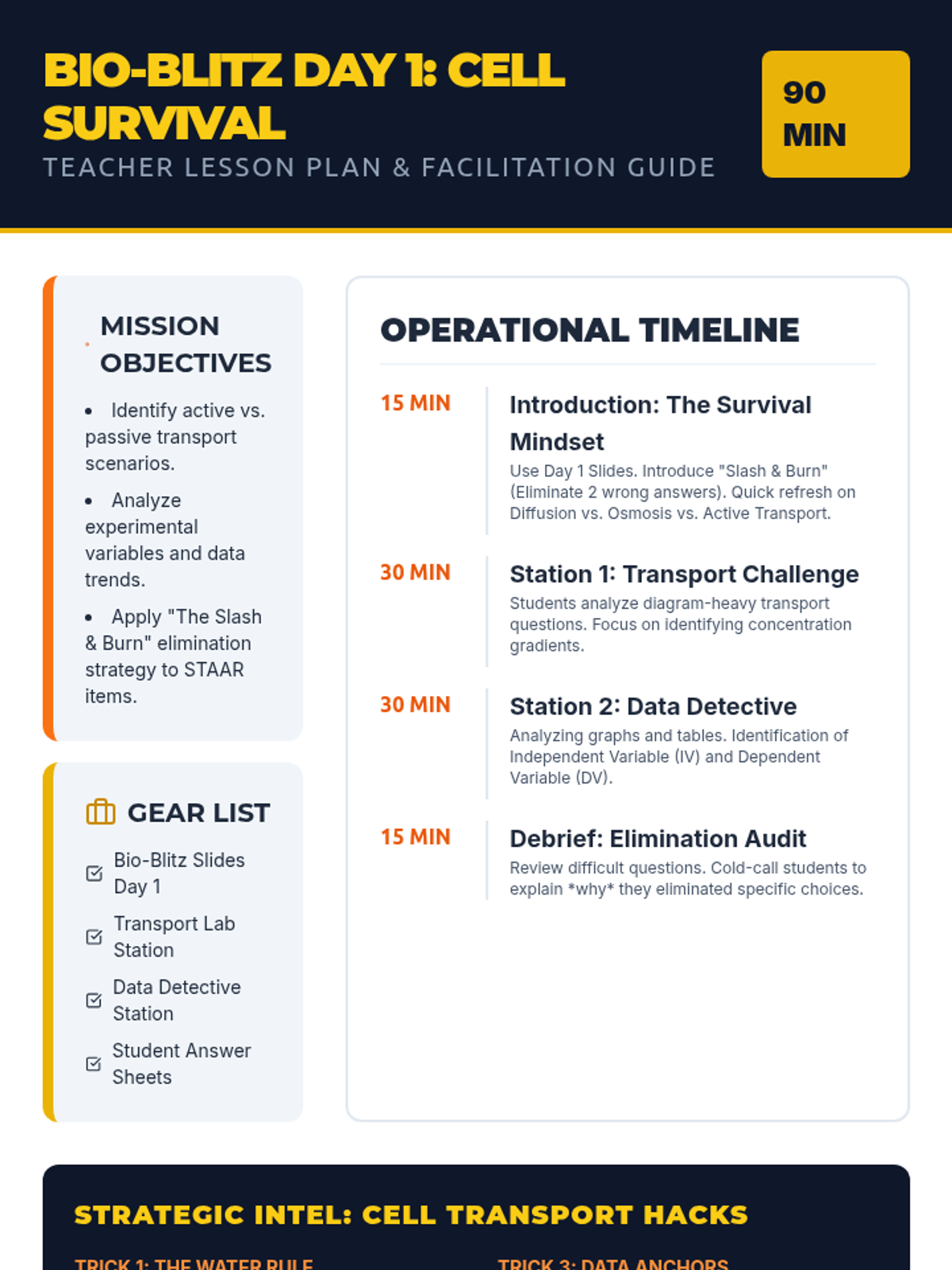 A detailed lesson plan for Day 1 of the Bio-Blitz review, focusing on cell transport and experimental design with timed segments and facilitation tips. Revised to fix page breaks, improve text contrast, and correct spacing in sub-headers.