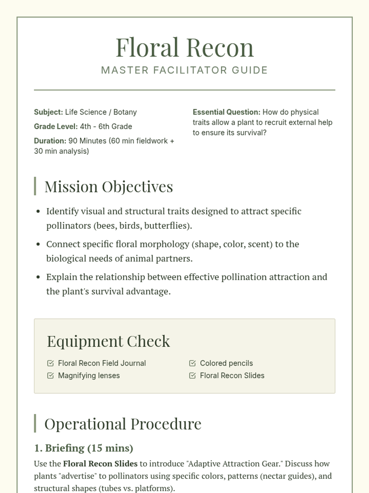 A comprehensive lesson plan for teachers, outlining mission objectives, required equipment, and a step-by-step procedure focusing entirely on pollinator attraction.
