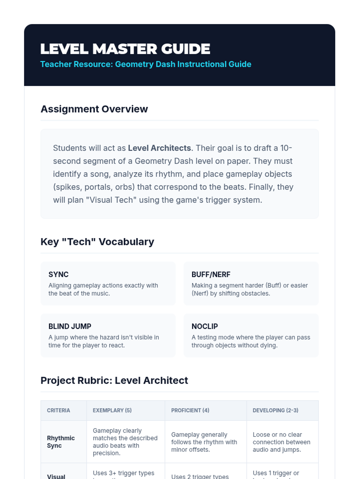 A teacher's guide for facilitating the Geometry Dash lesson, including vocabulary definitions, a project rubric, and discussion prompts.